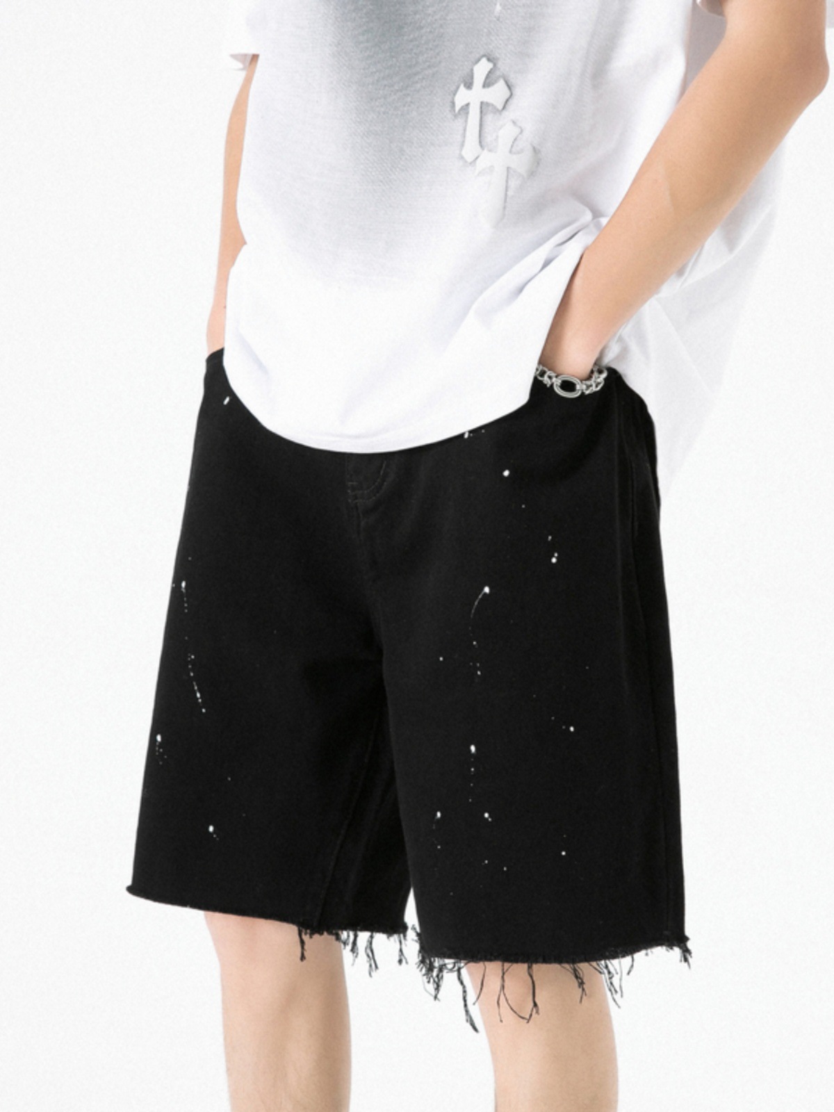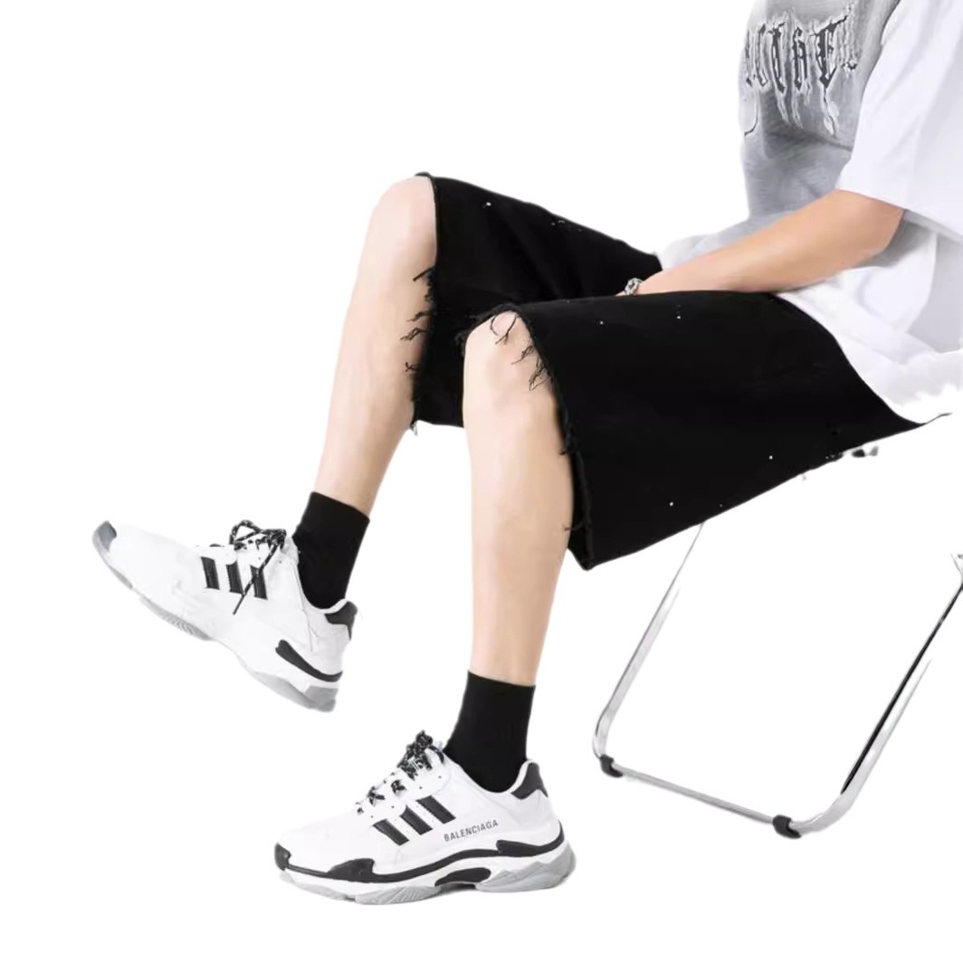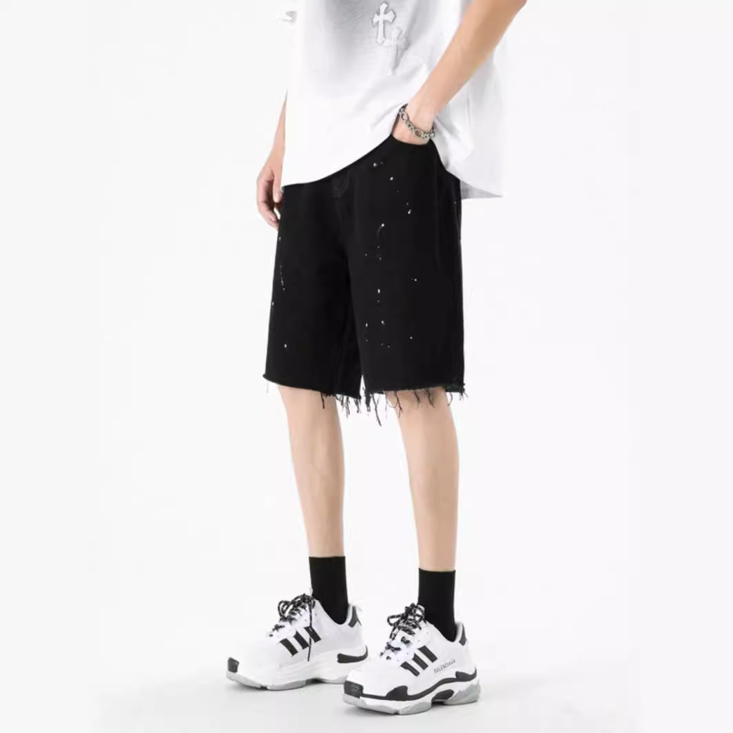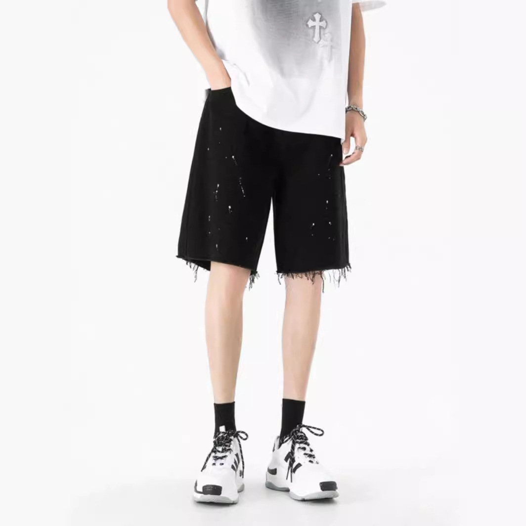 夏季薄款泼墨黑色牛仔短裤男潮牌美式高街vibe宽松直筒百搭五分裤