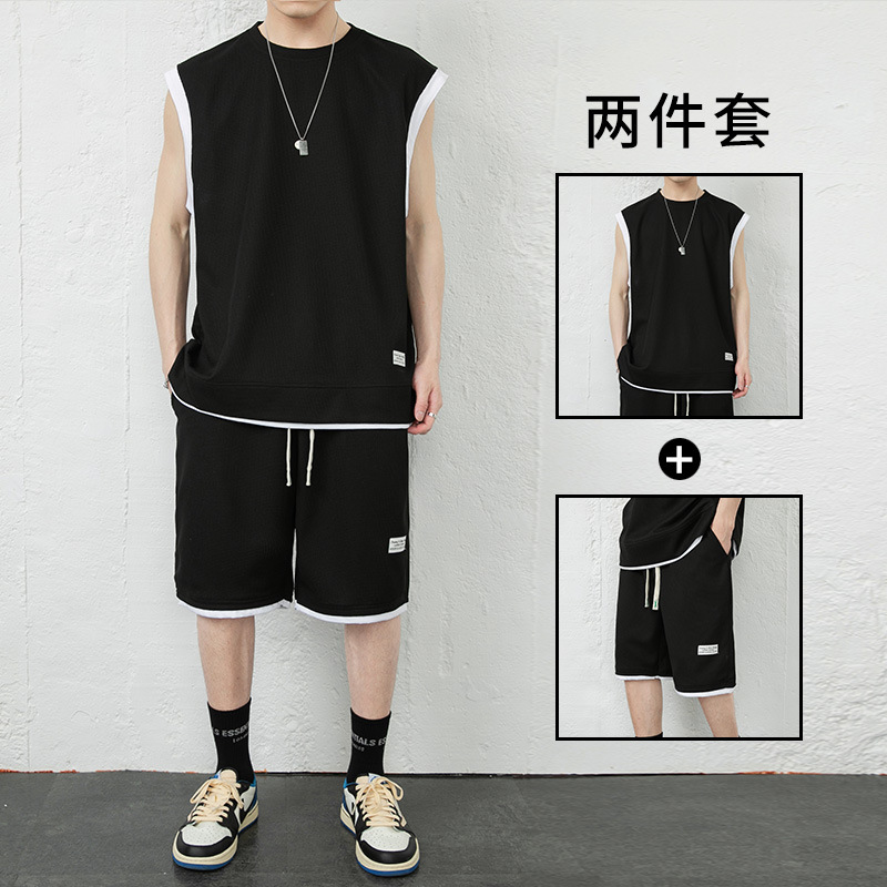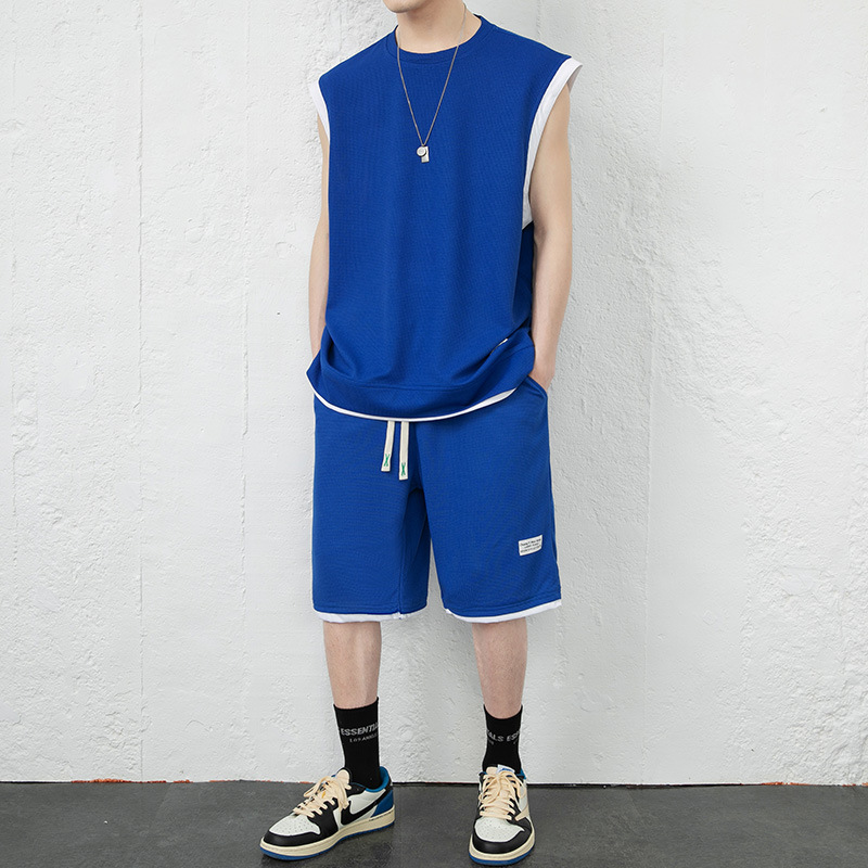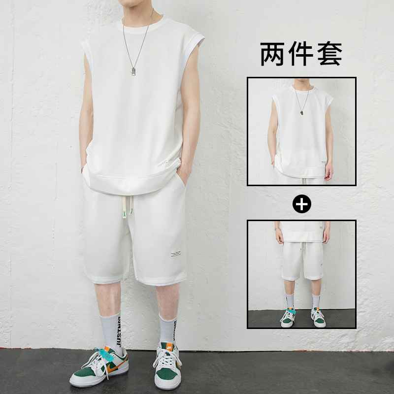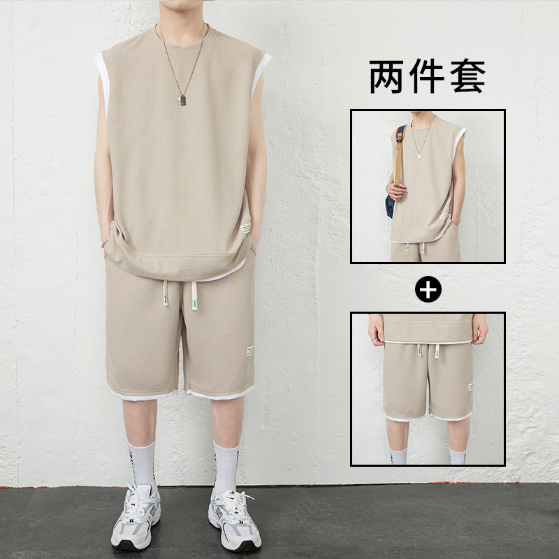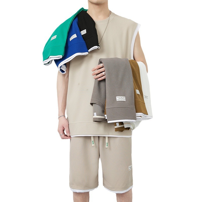 优质华夫格假两件无袖背心套装男夏季运动套装男生一套五分裤短裤