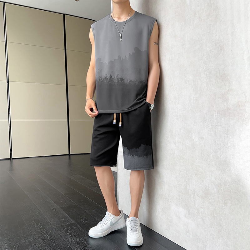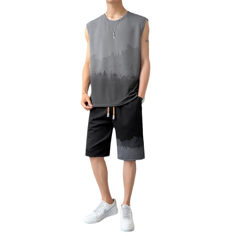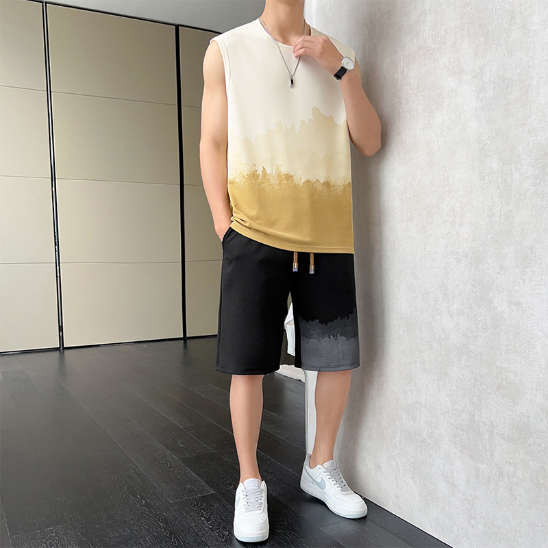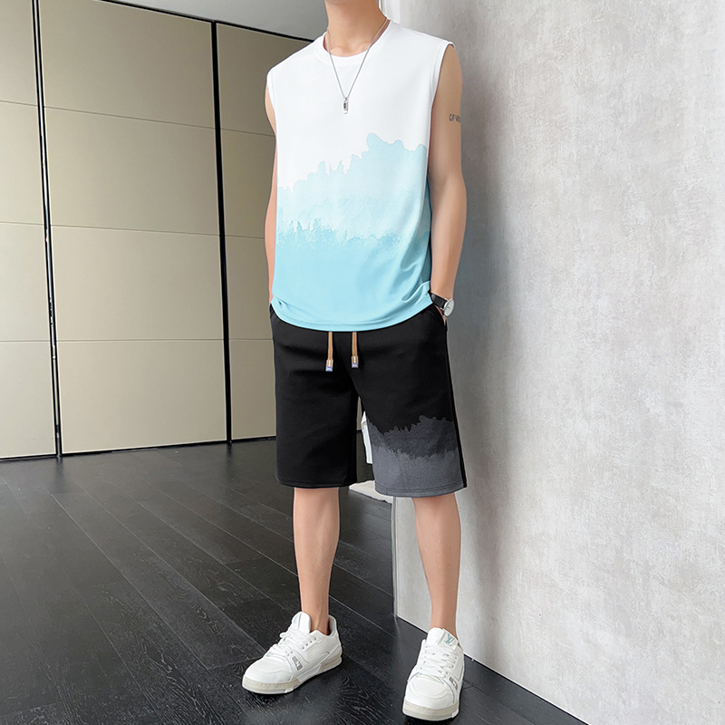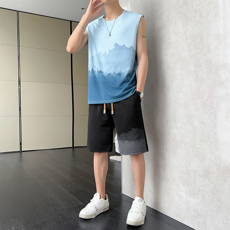 优质休闲运动套装男士夏季薄款无袖t恤渐变背心短裤帅气一套衣服