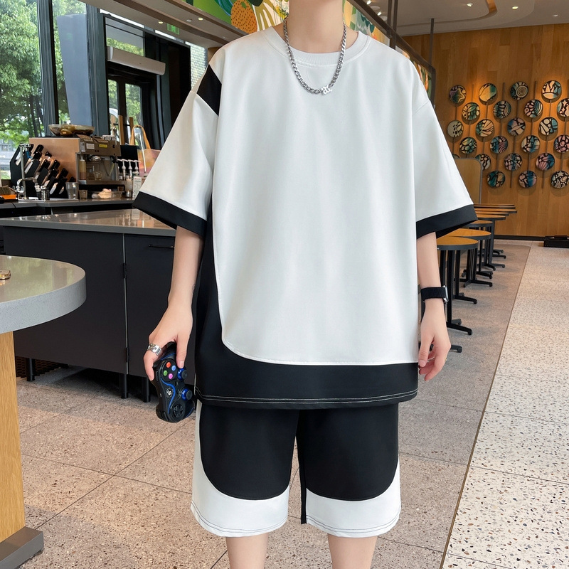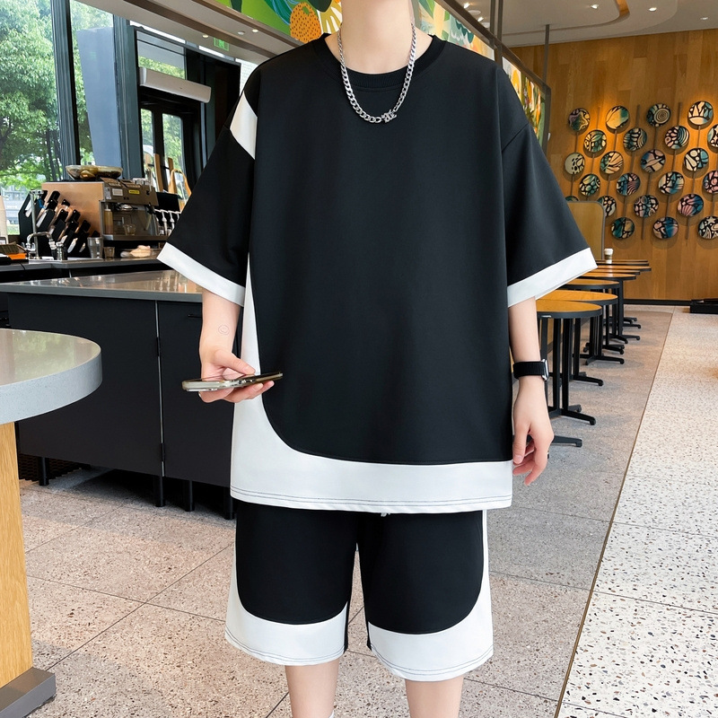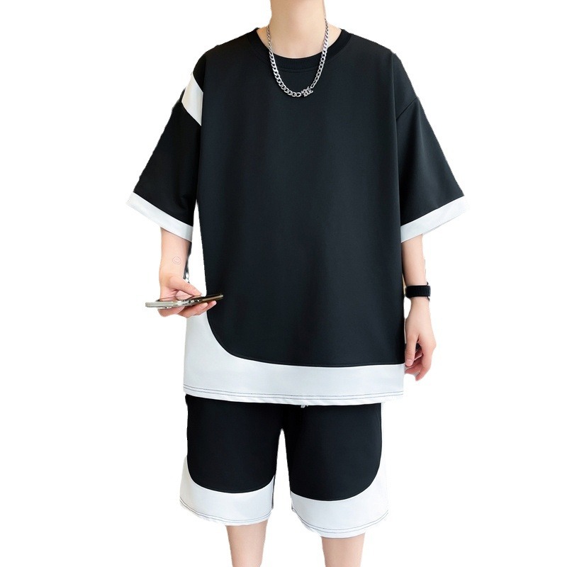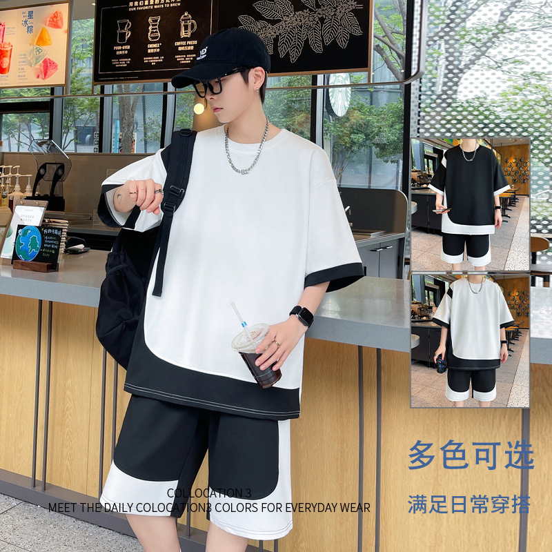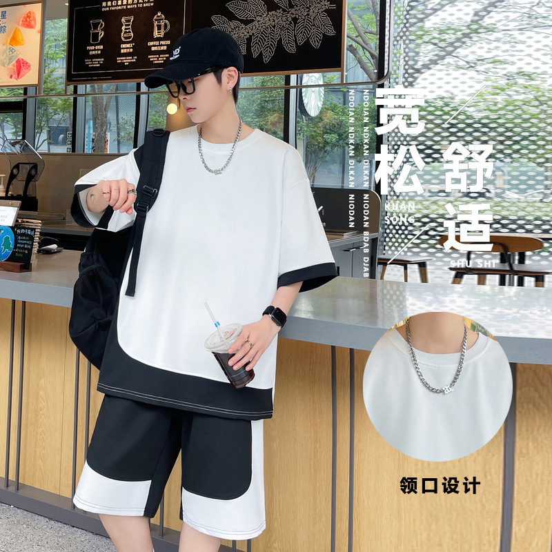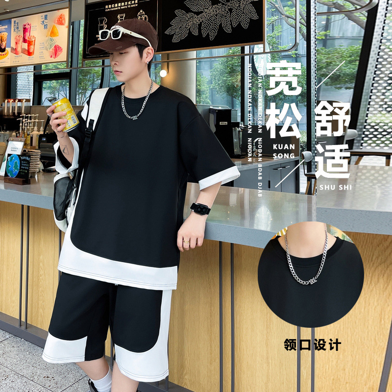 优质拼接运动套装男款夏季薄款休闲舒适透气夏装短袖搭配一整套男