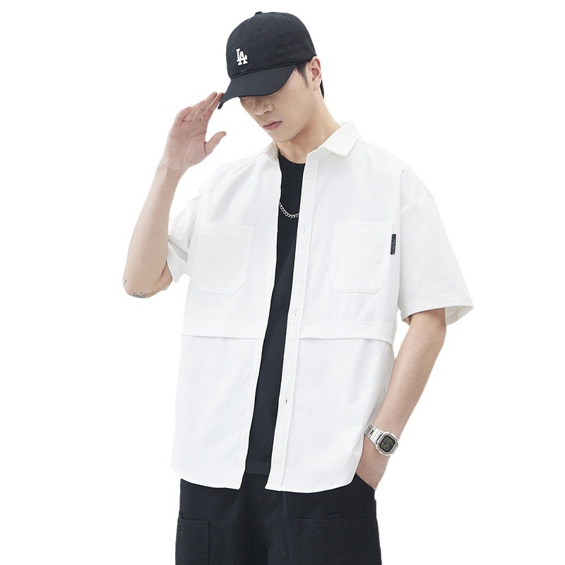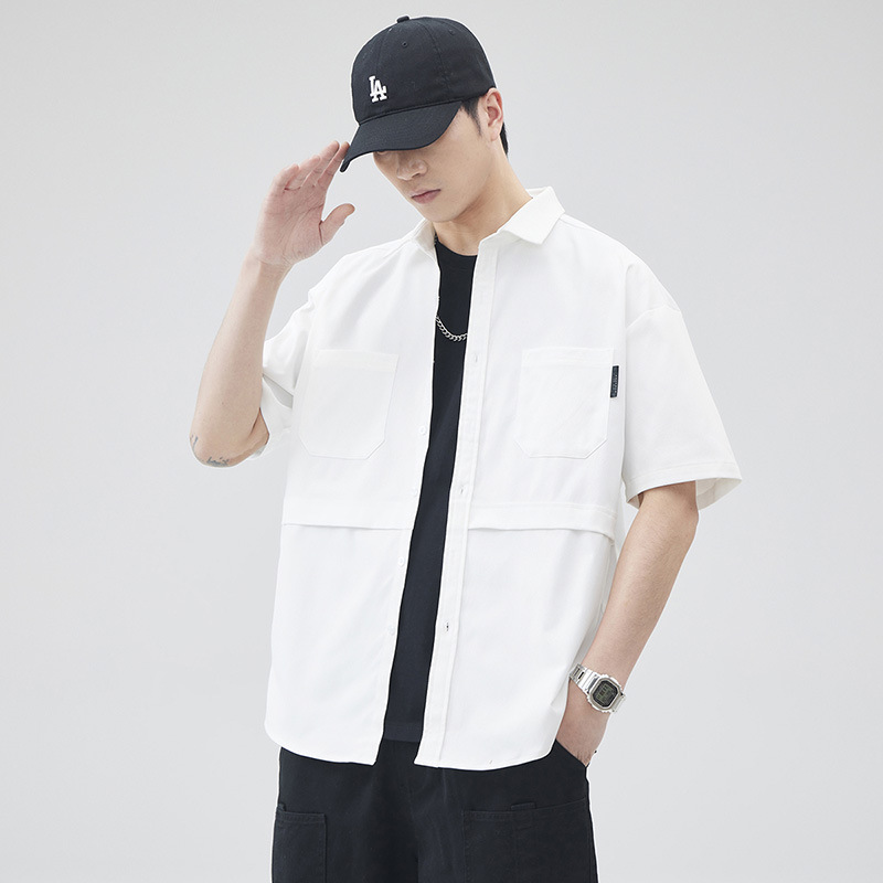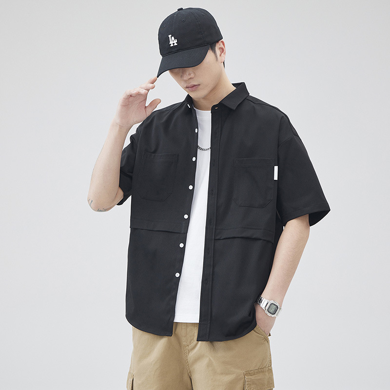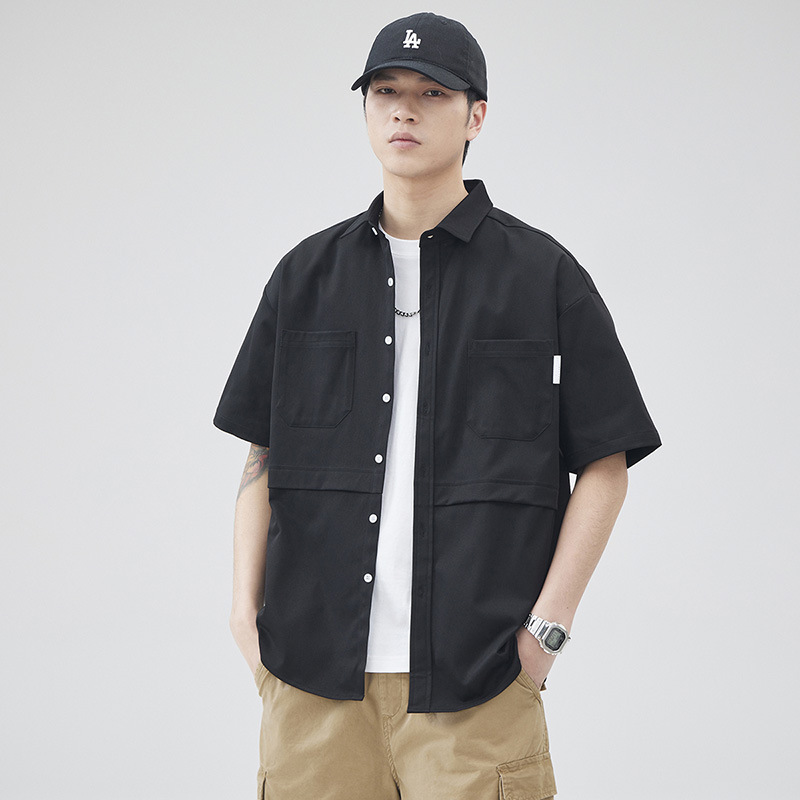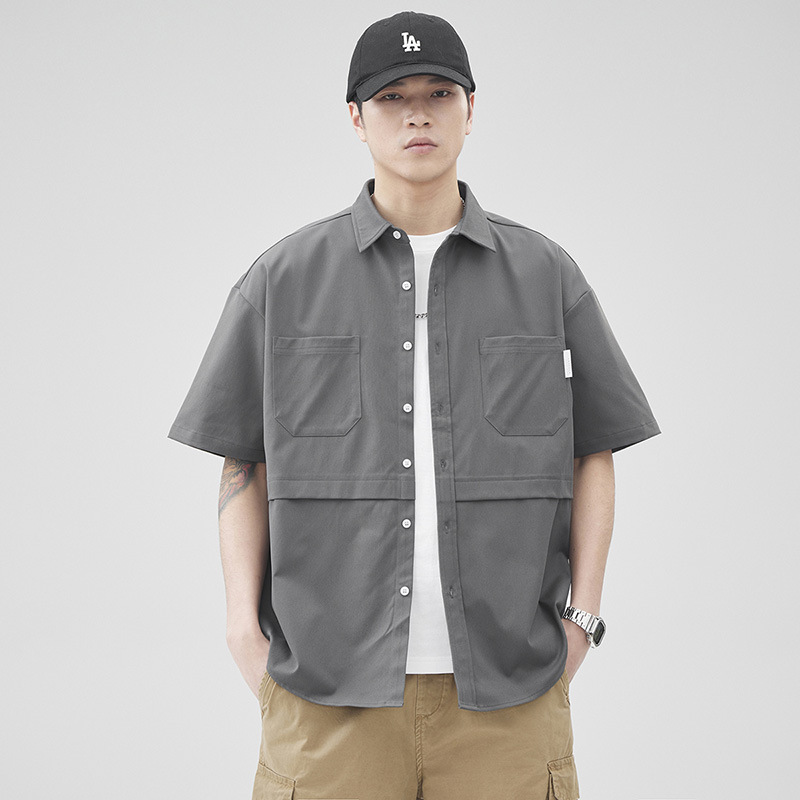 优质日系复古拼接短袖衬衫男女中性风宽松休闲多口袋工装衬衣外套