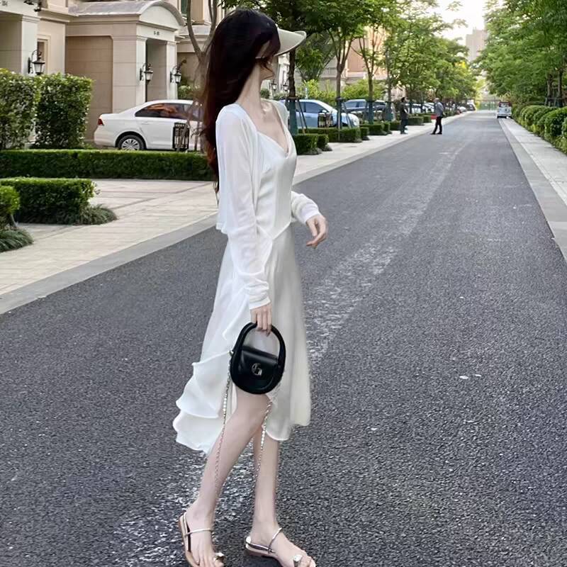 夏季新款法式温柔风套装白色开衫荷叶边吊带连衣裙子两件套装