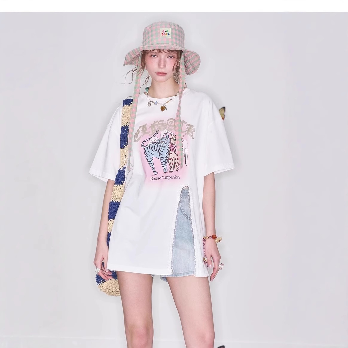 白色印花开叉短袖t恤女2025春新款宽松休闲设计感上衣
