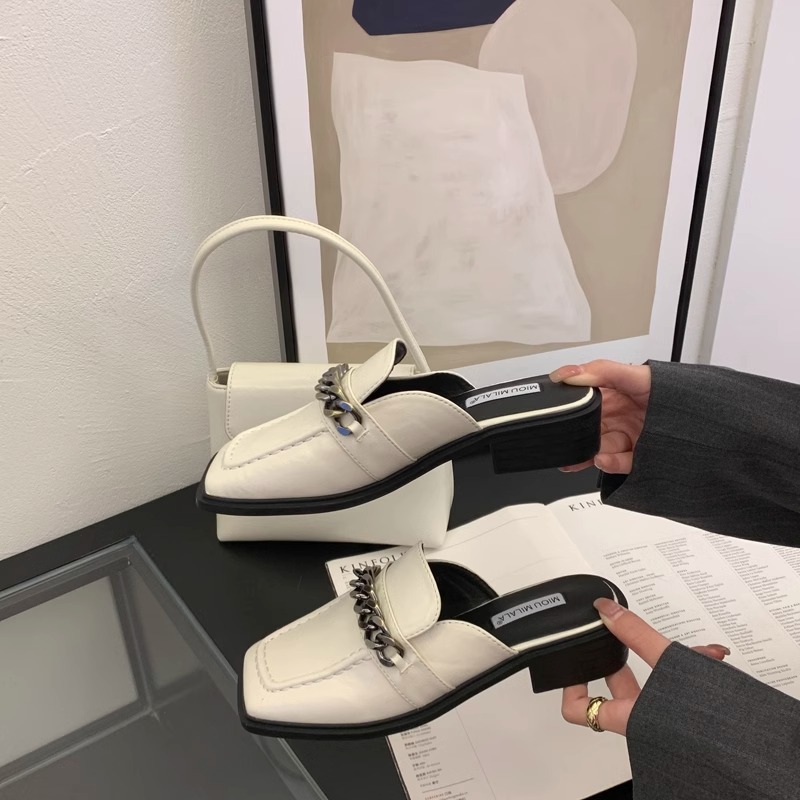 春季新款ins酷凉拖方头粗跟懒人拖鞋时尚链子包头拖鞋
