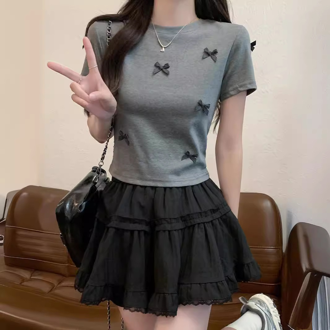 别致复古波点蝴蝶结短袖T恤女夏季修身短款正肩套头上衣代发货源