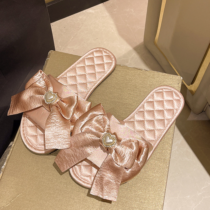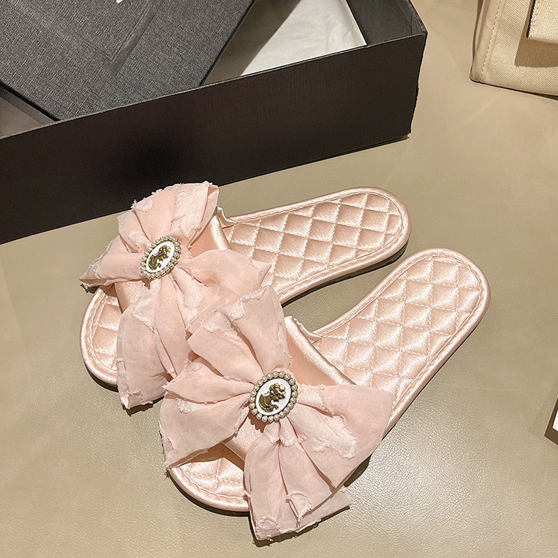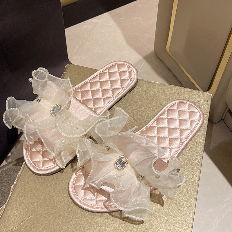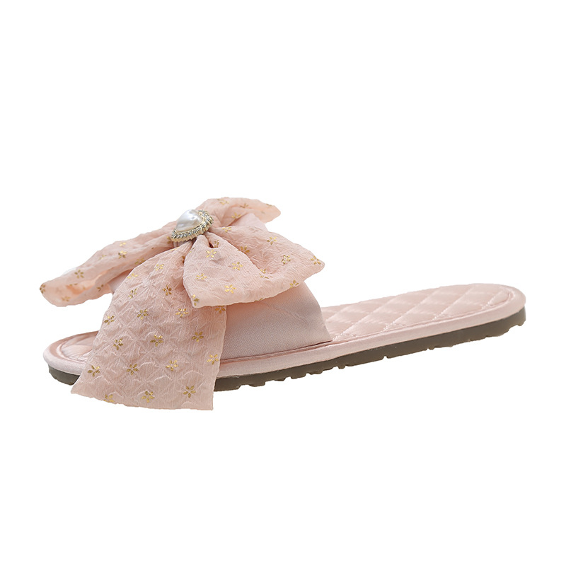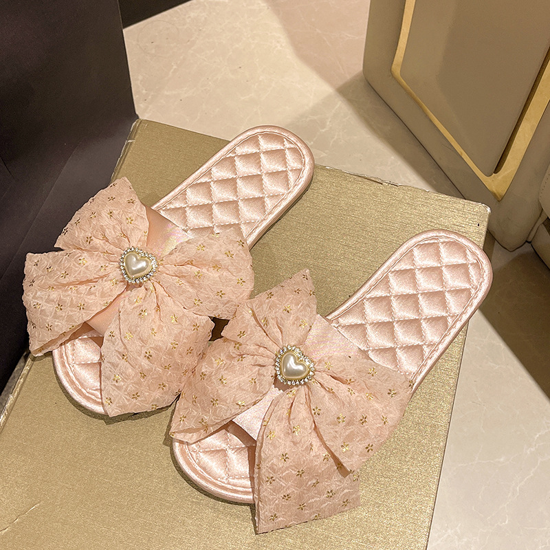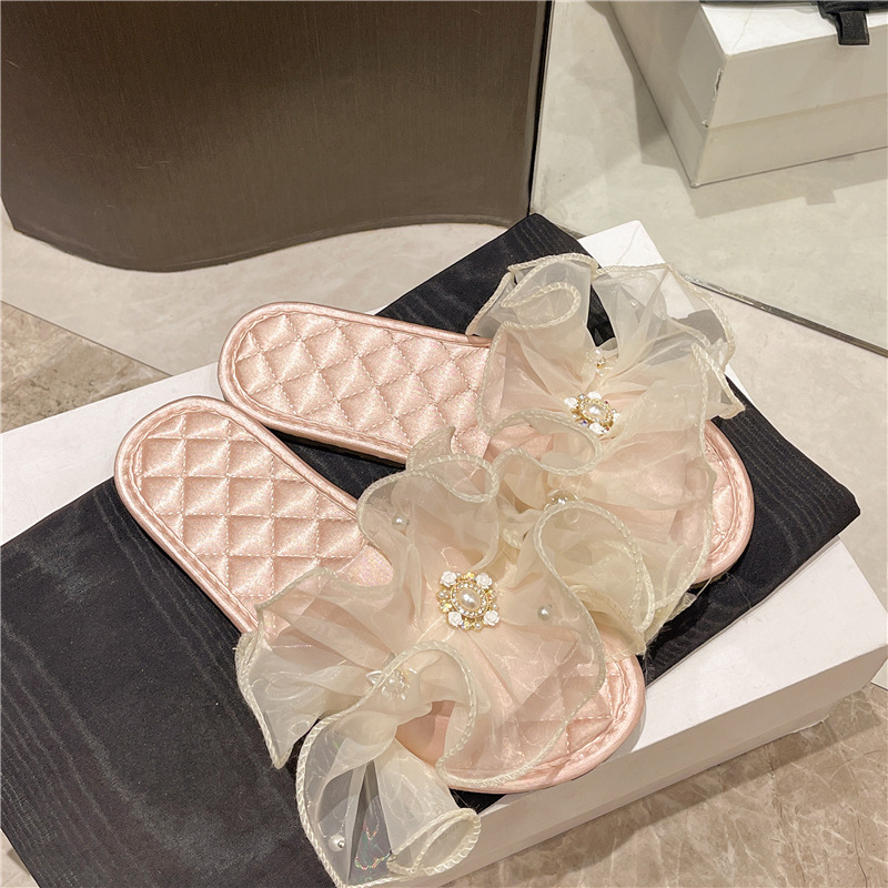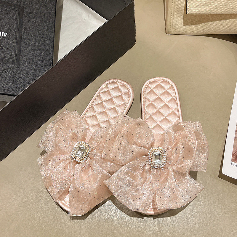 甜美ins风网纱蝴蝶结缎面新娘伴娘一字拖居家配晨袍防滑家用拖鞋