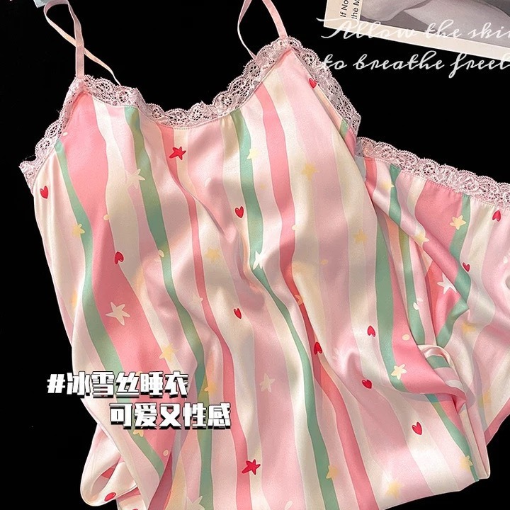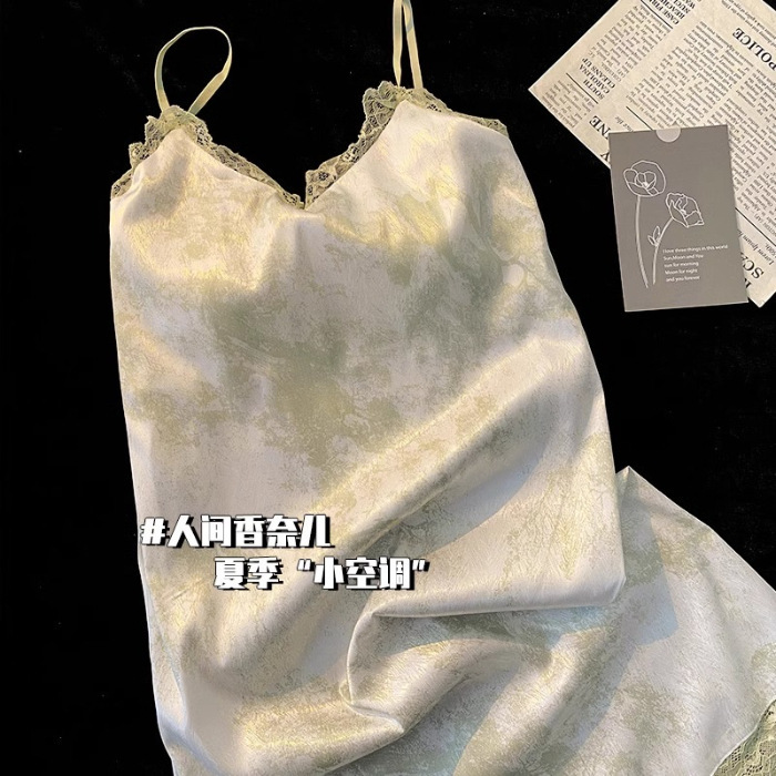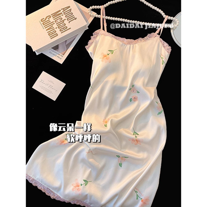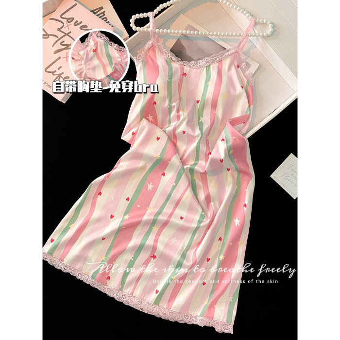 {带胸垫}ins风夏季女款冰丝仿真丝绸睡衣性感甜美吊带裙家居服