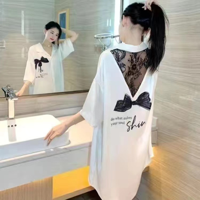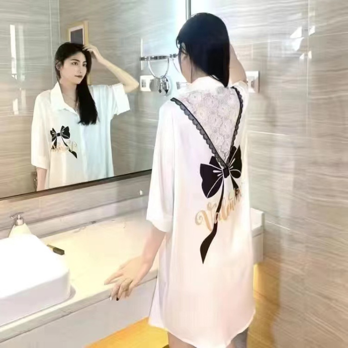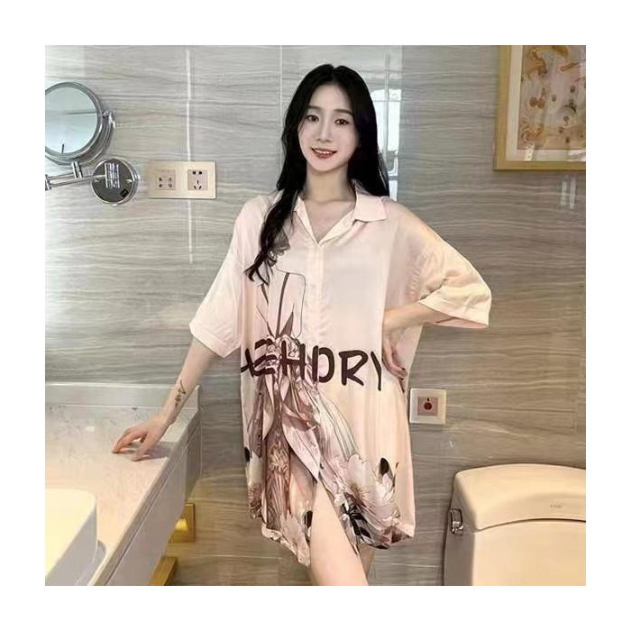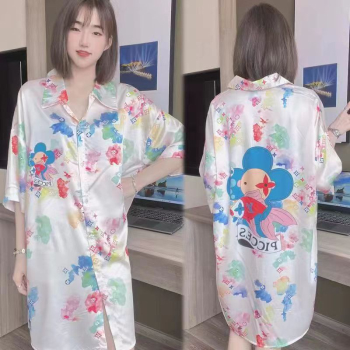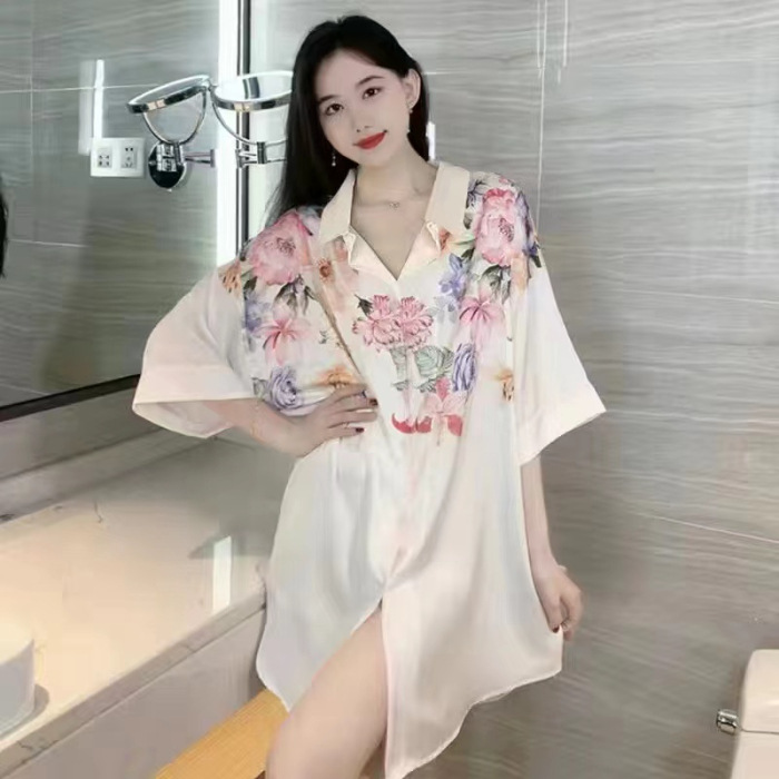 夏季新款睡裙女薄款印花短袖衬衫裙中长款冰丝性感开衫家居服女