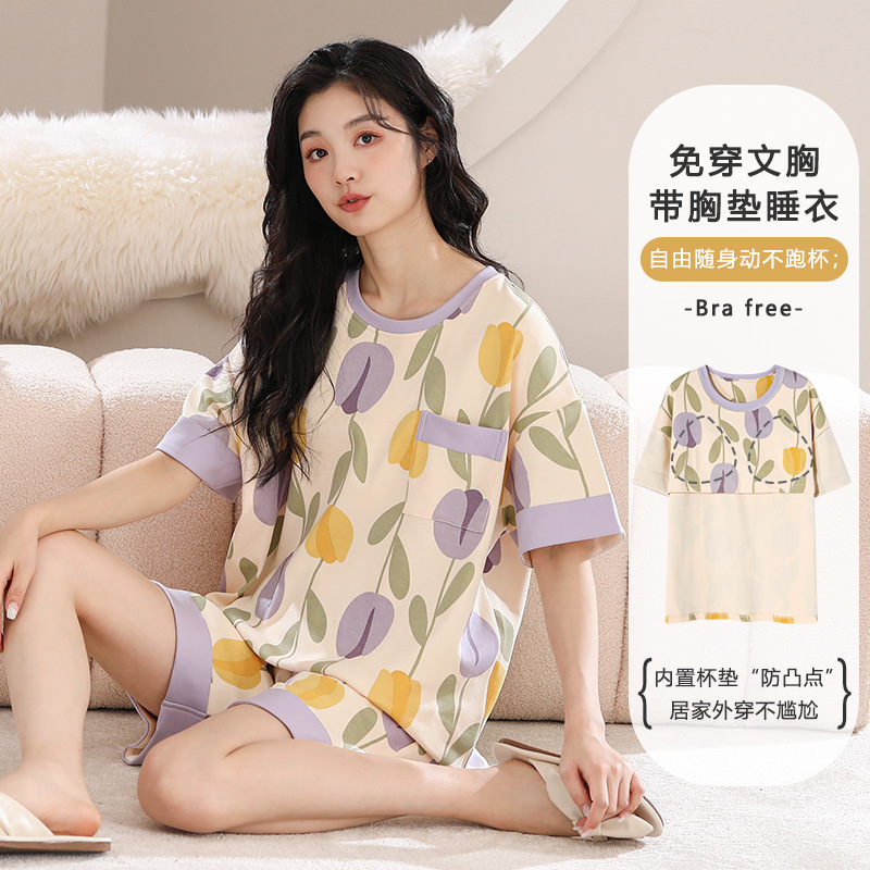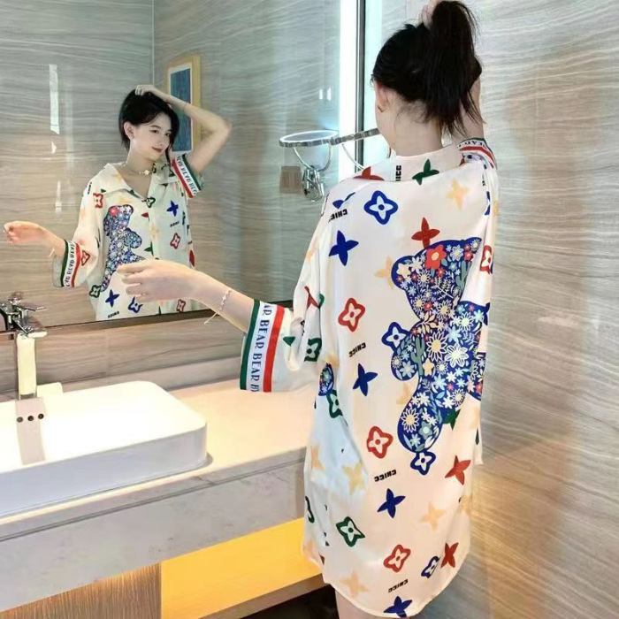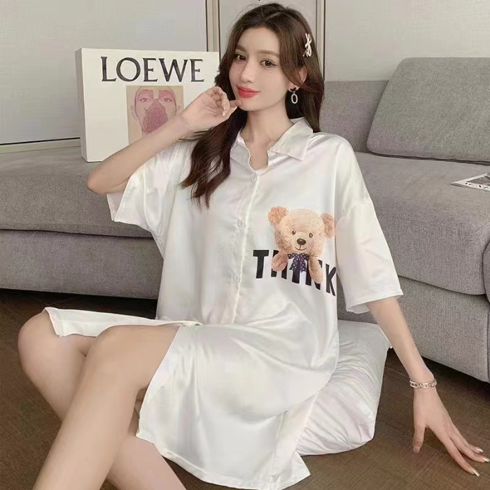 夏季新款睡裙女薄款印花短袖衬衫裙中长款冰丝性感开衫家居服女