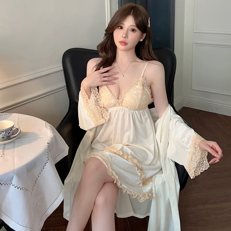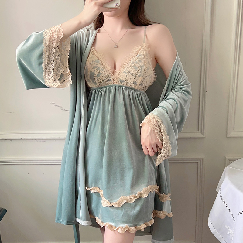 金丝绒睡衣女春秋冬性感吊带蕾丝纯欲风长袖睡袍家居服带胸垫睡袍