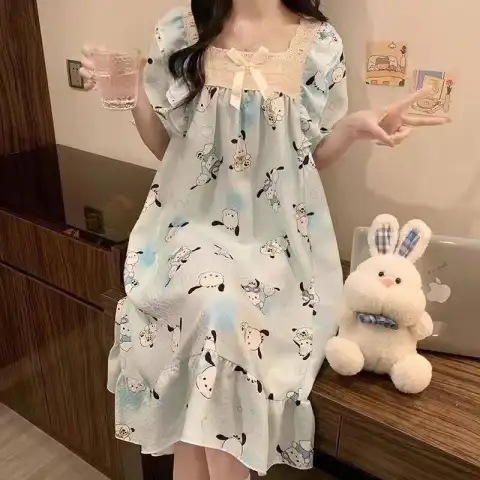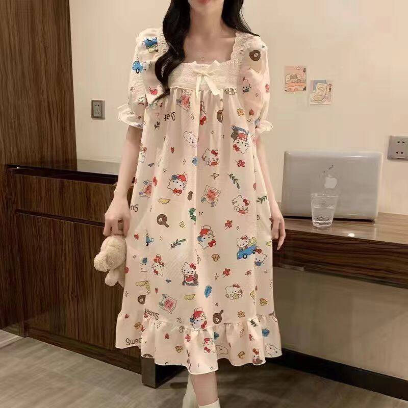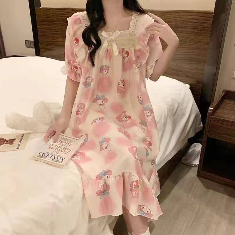 新品-夏季新款泡泡棉方领卡通短袖花边睡裙短袖短裤家居服可外穿