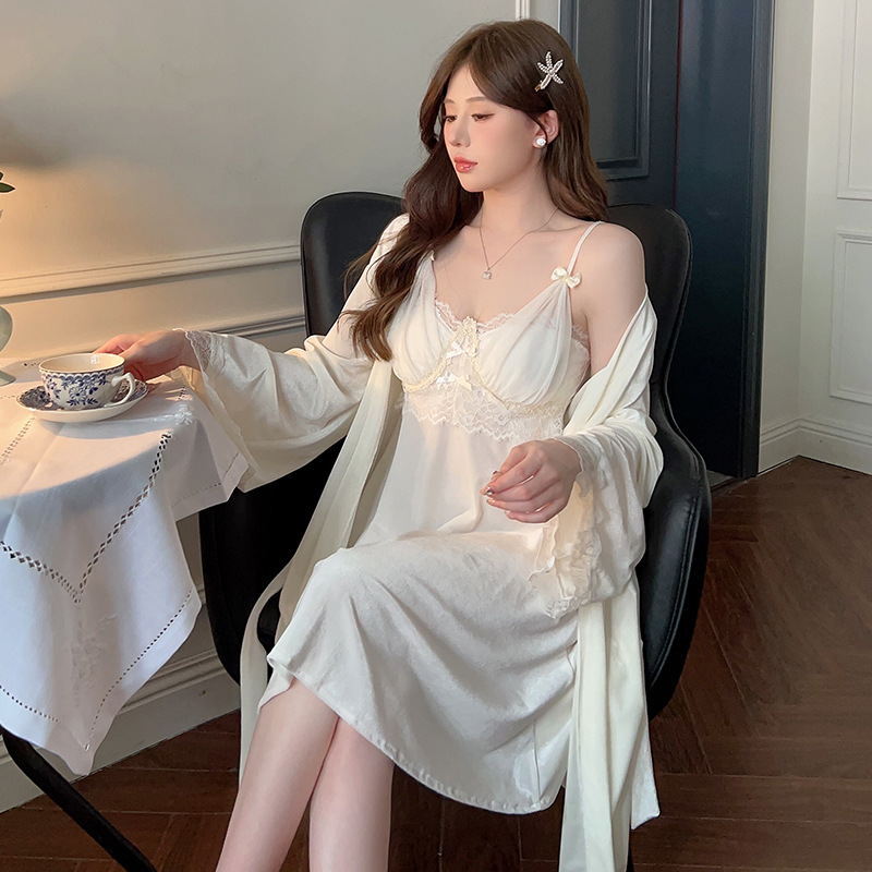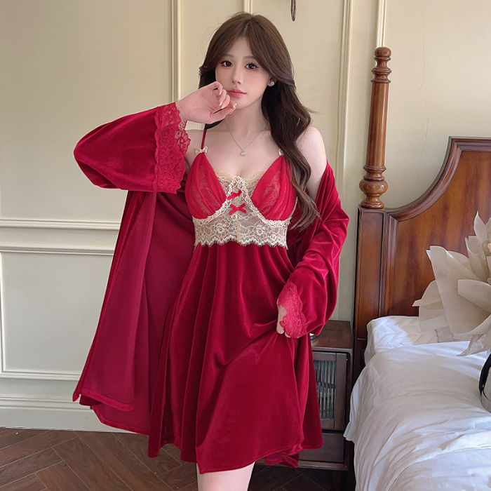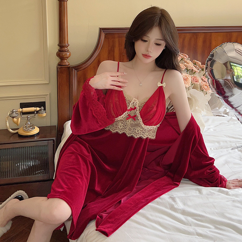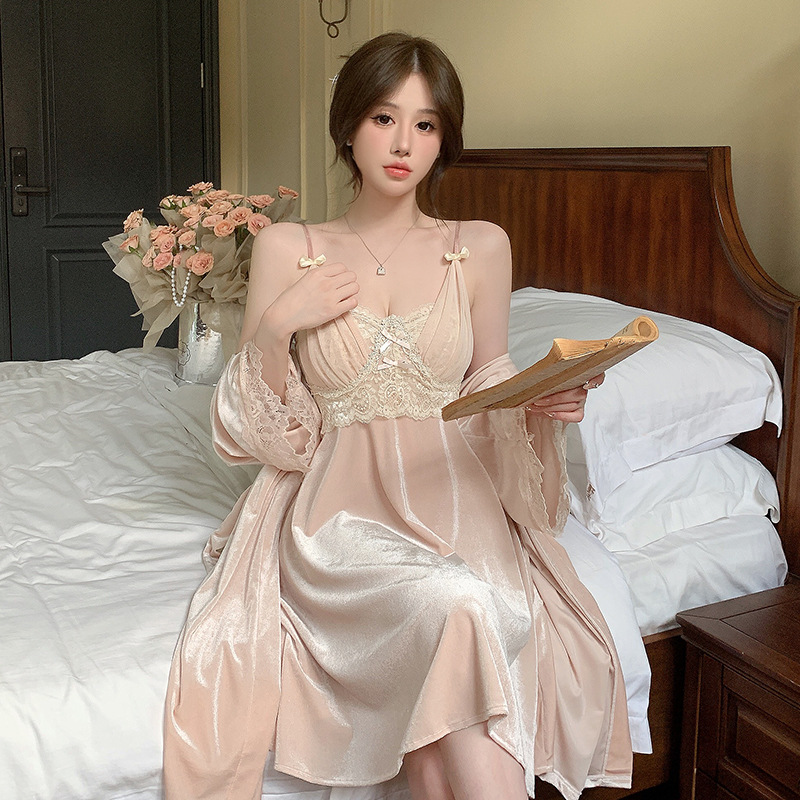 金丝绒睡衣女春秋冬性感吊带蕾丝纯欲风长袖睡袍家居服带胸垫睡袍