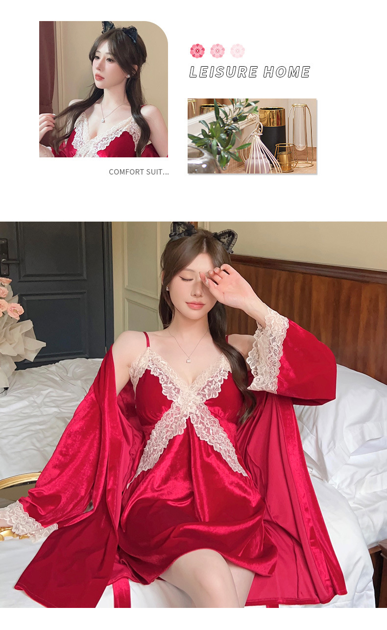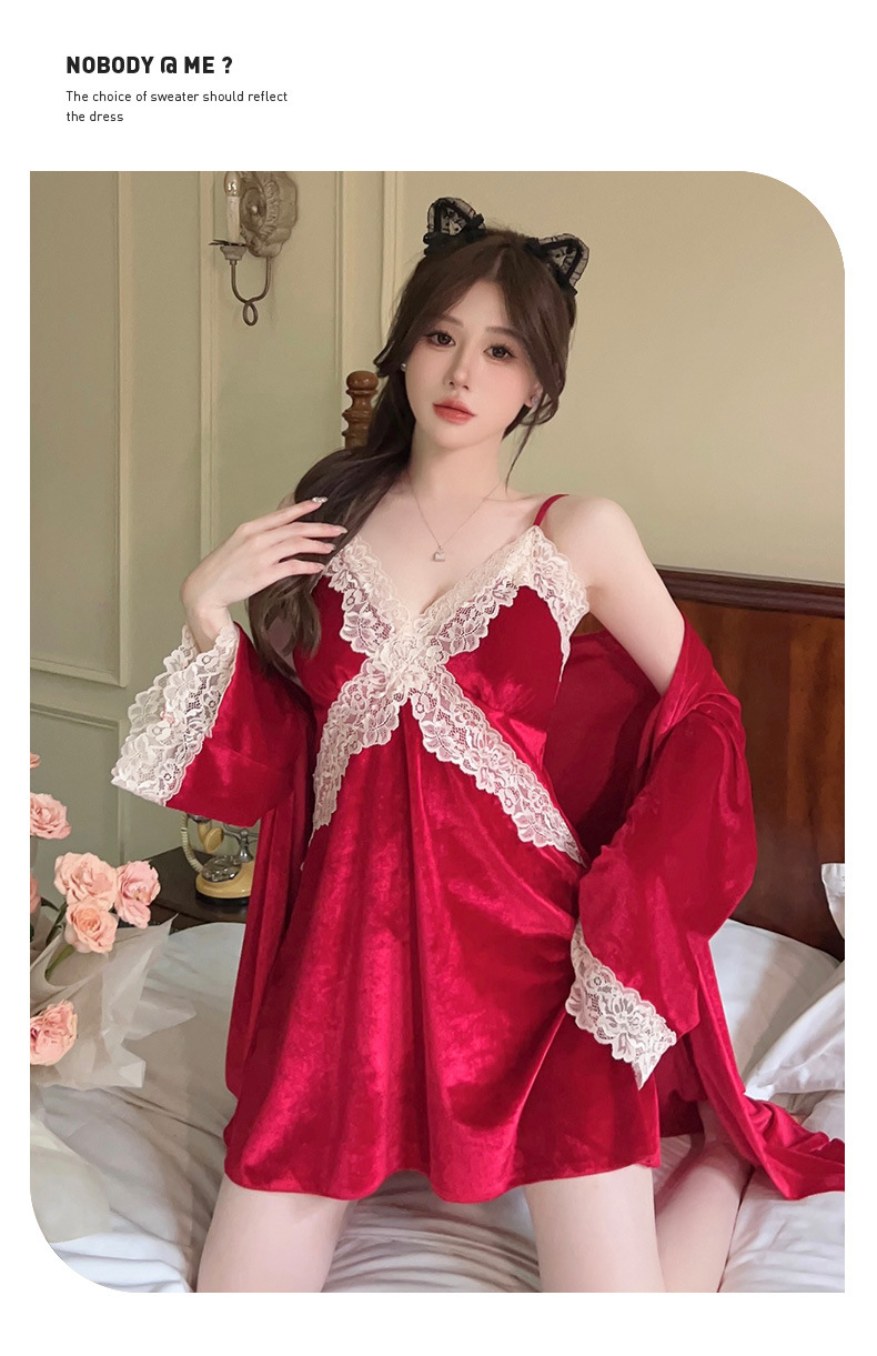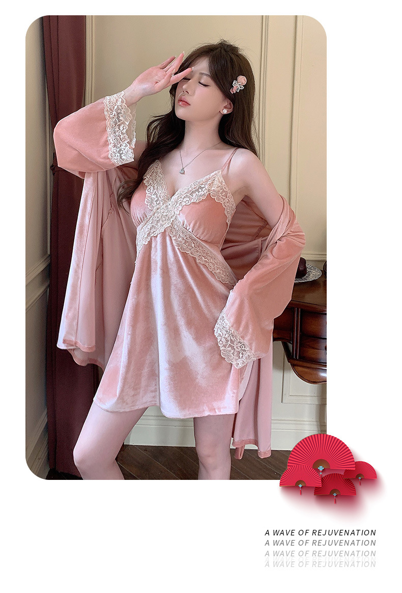 金丝绒睡衣女春秋冬性感吊带蕾丝纯欲风长袖睡袍家居服带胸垫睡袍