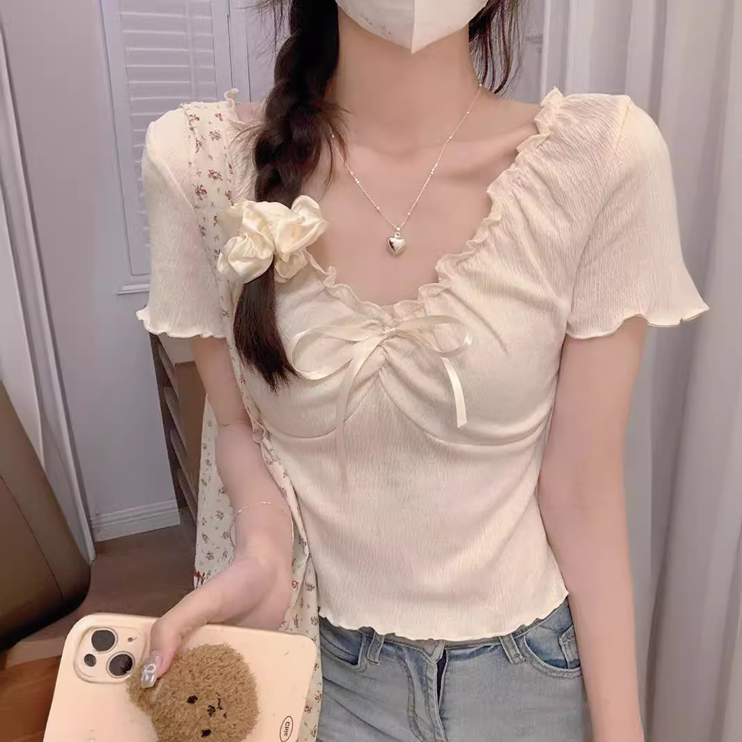 QIANFUDUO别致木耳边系带半袖短款上衣夏纯欲蕾丝花边修身短袖t恤