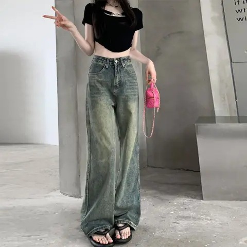 怀旧复古高腰直筒牛仔裤女梨形遮肉休闲美式宽松拖地阔腿长裤子秋