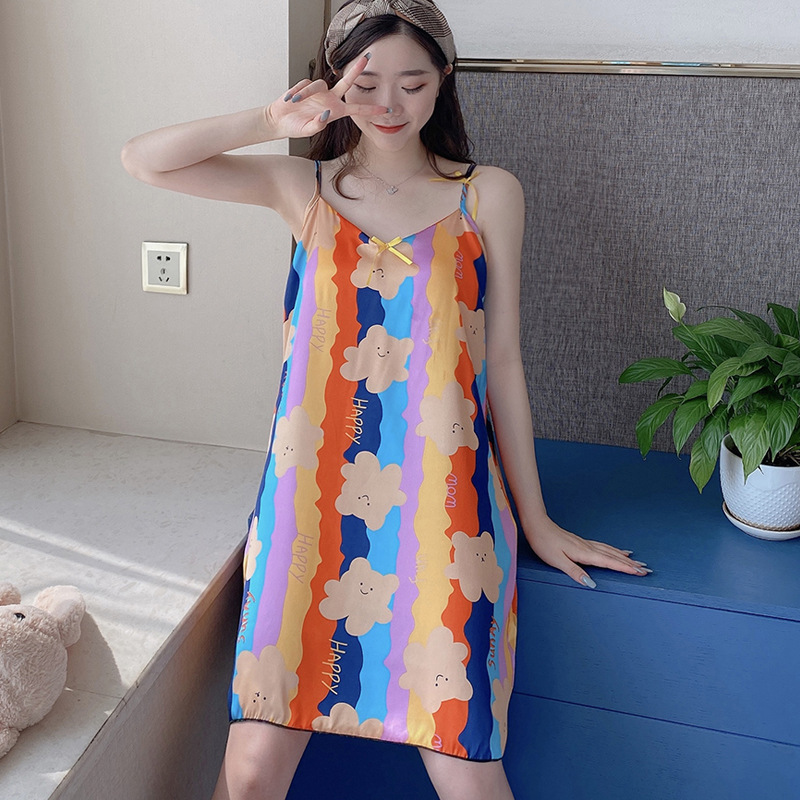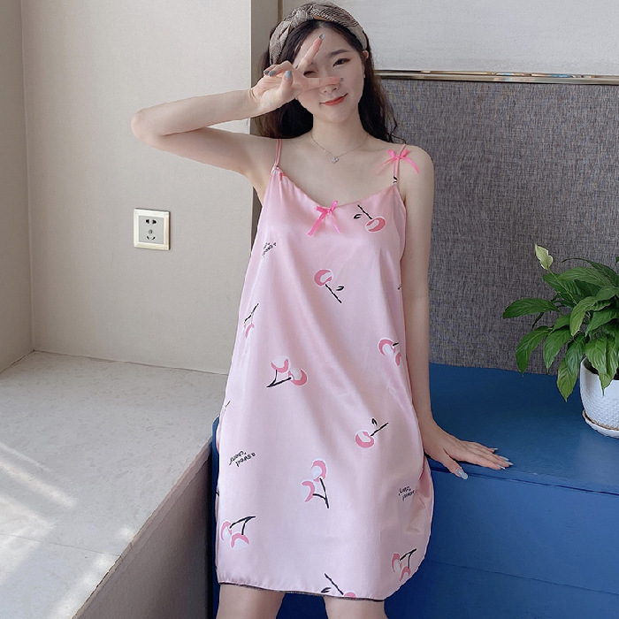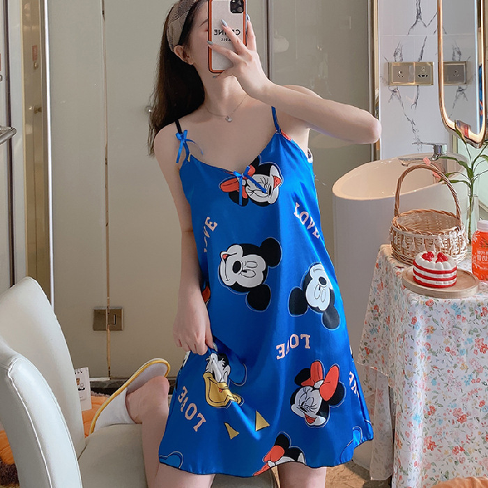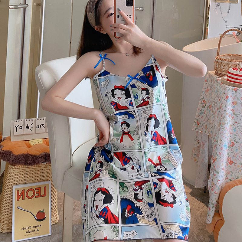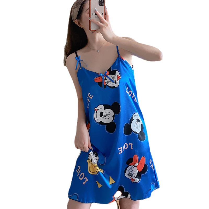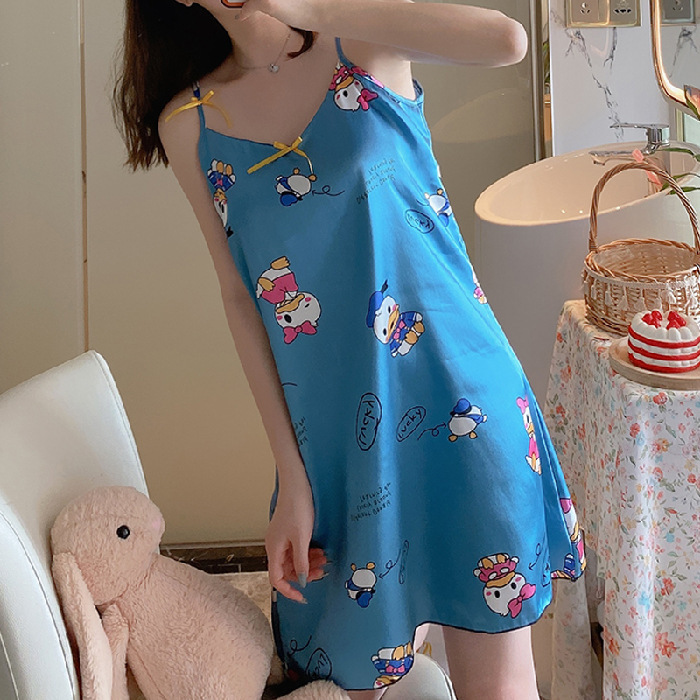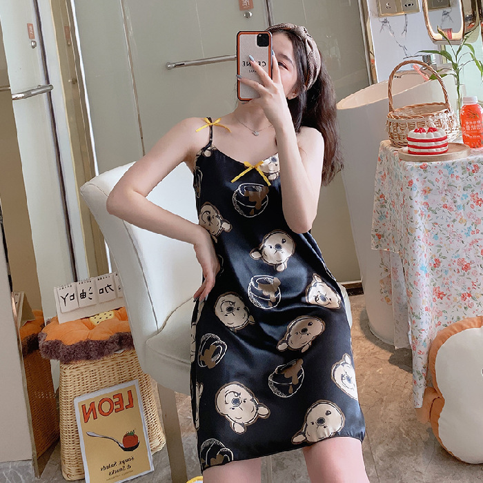 新品夏季睡裙女可调节肩带性感色丁吊带裙卡通甜美睡衣送胸垫