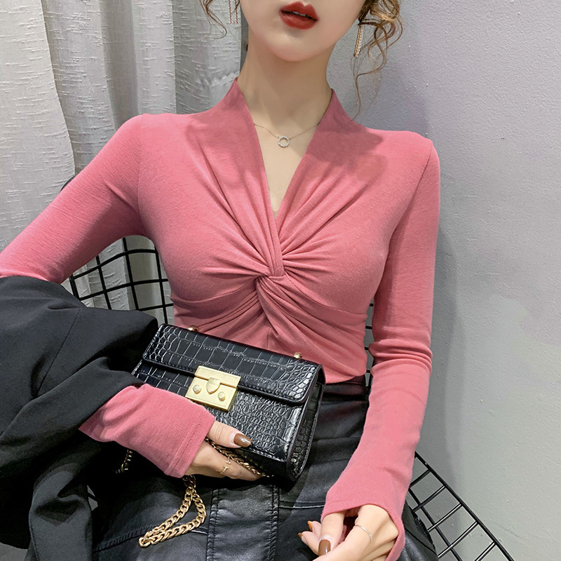 v领长袖t恤女修身初秋新款洋气打底衫别致纽扣设计感上衣