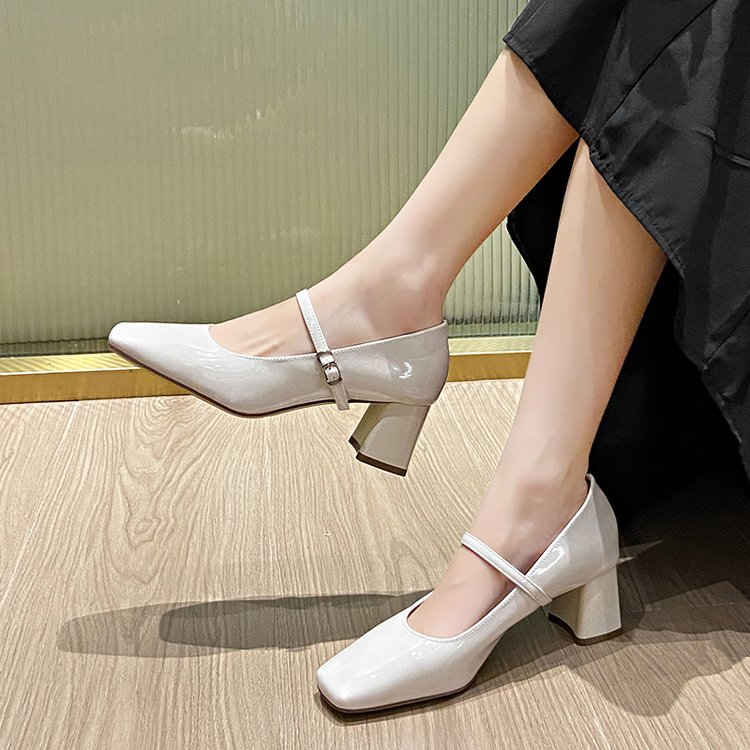 春季新款粗跟单鞋女方头浅口一字搭扣玛丽珍鞋漆皮高跟鞋