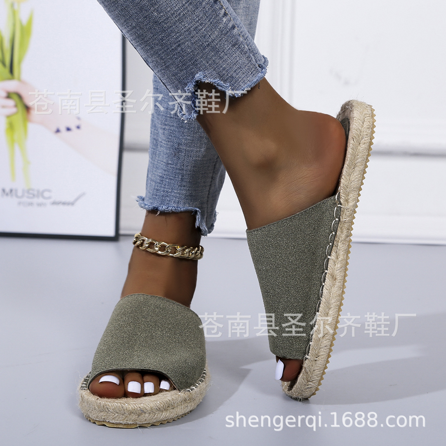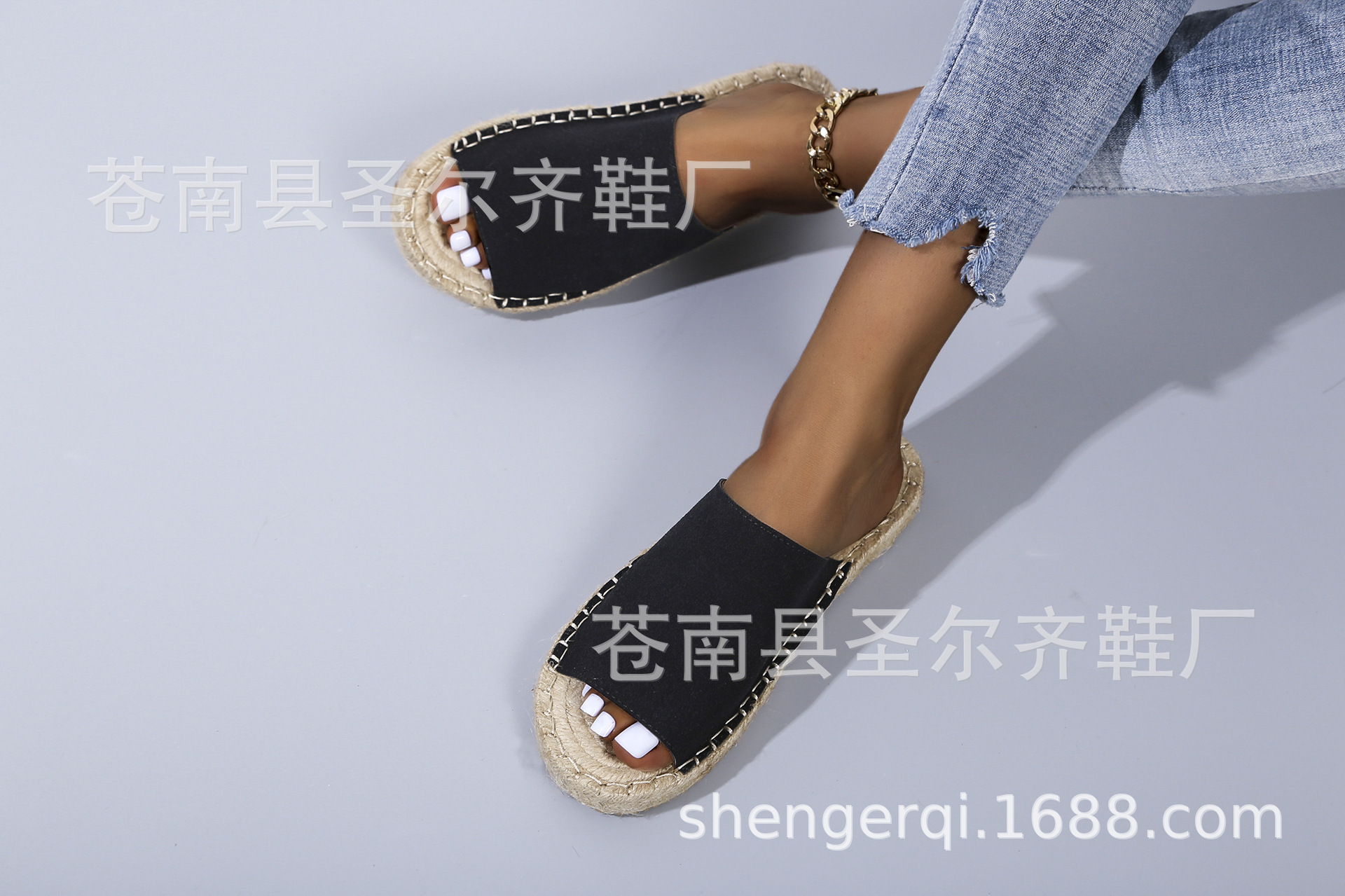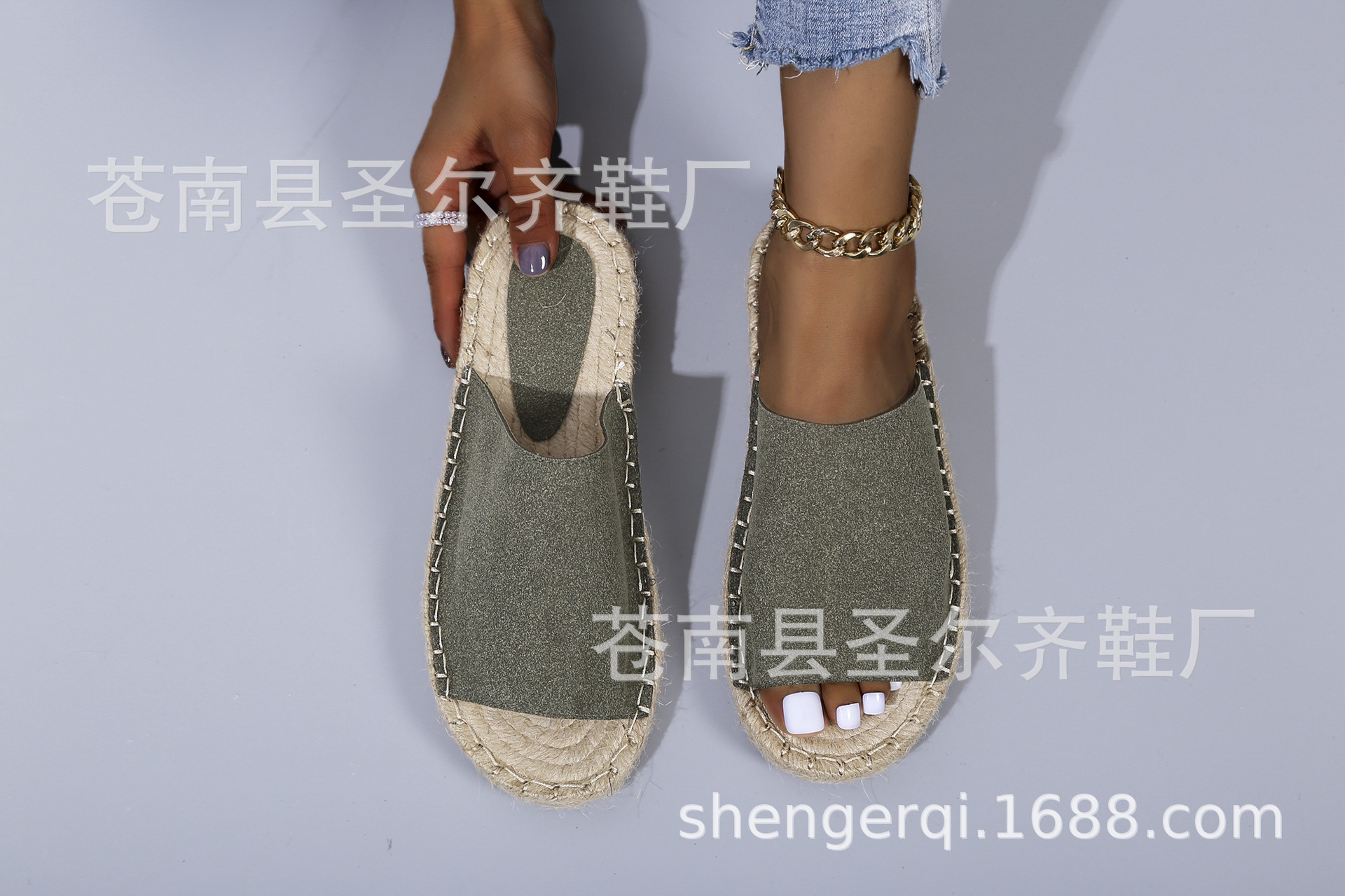 wish亚马逊穆勒一片式缝线渔夫休闲平底手工草编真麻绳底拖鞋
