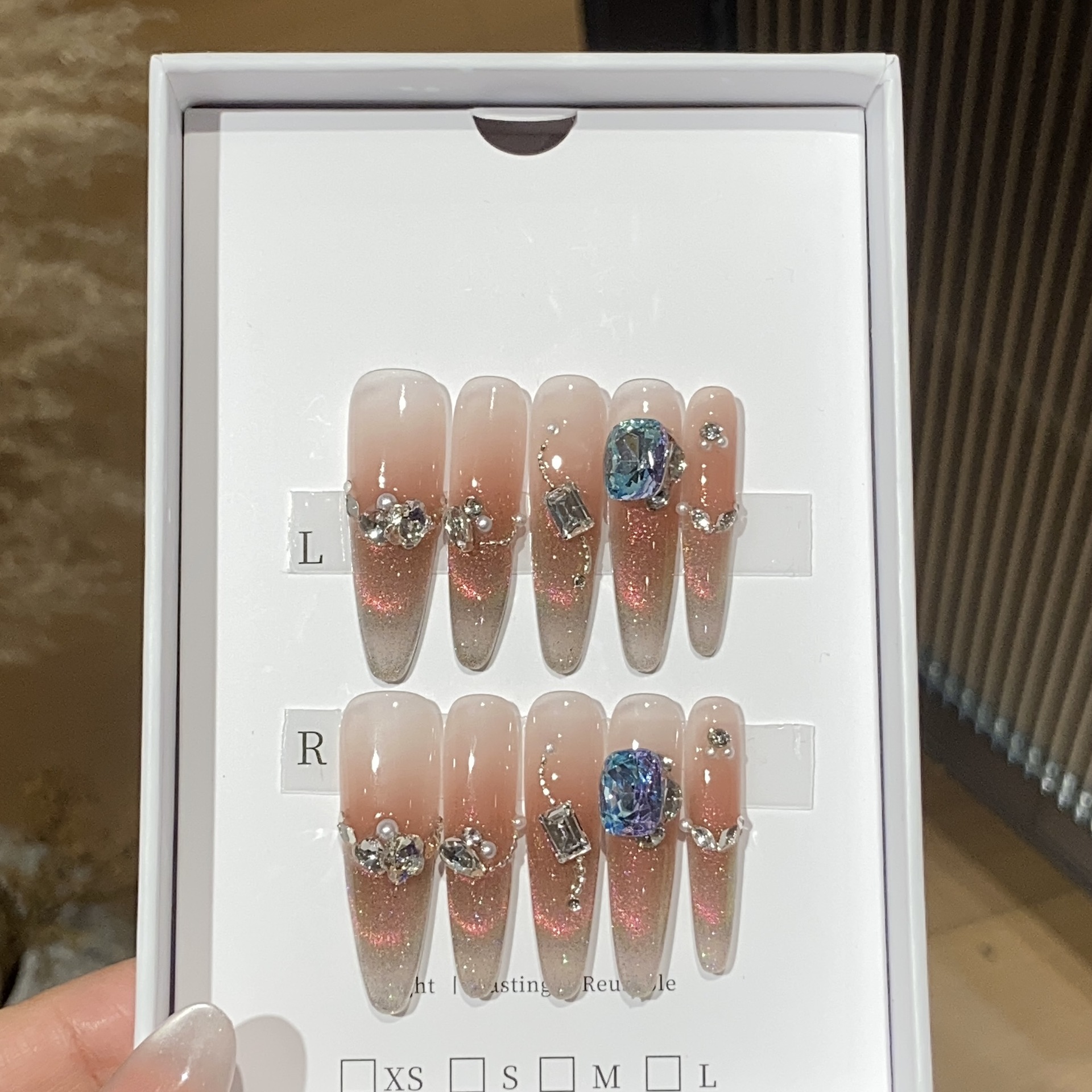 一只顾美甲 冰透粉色极光猫眼珍珠碎钻合金链条蓝色方钻碎金蔷薇