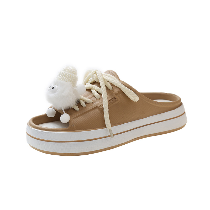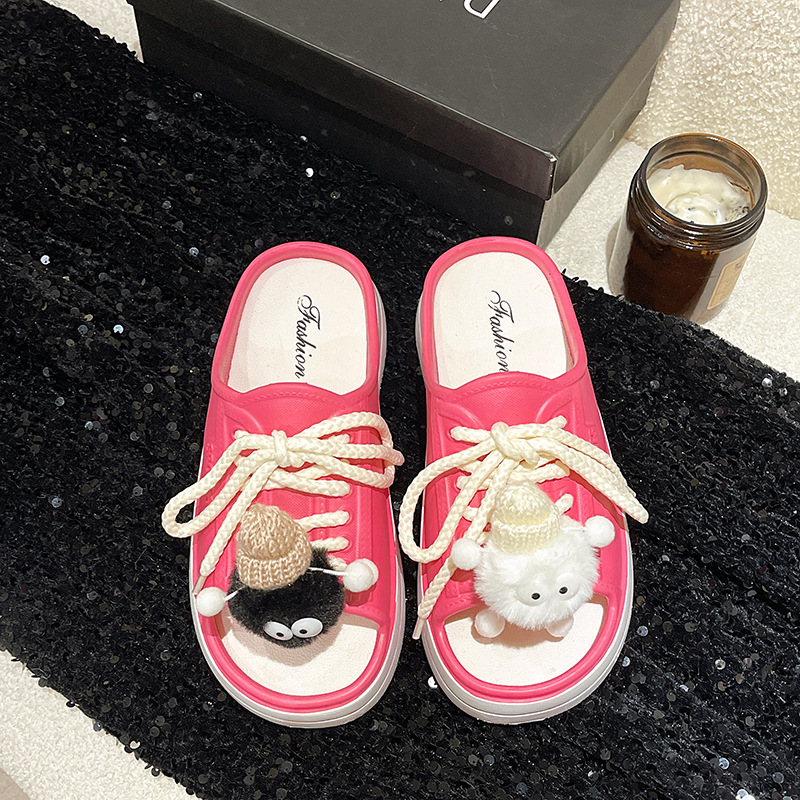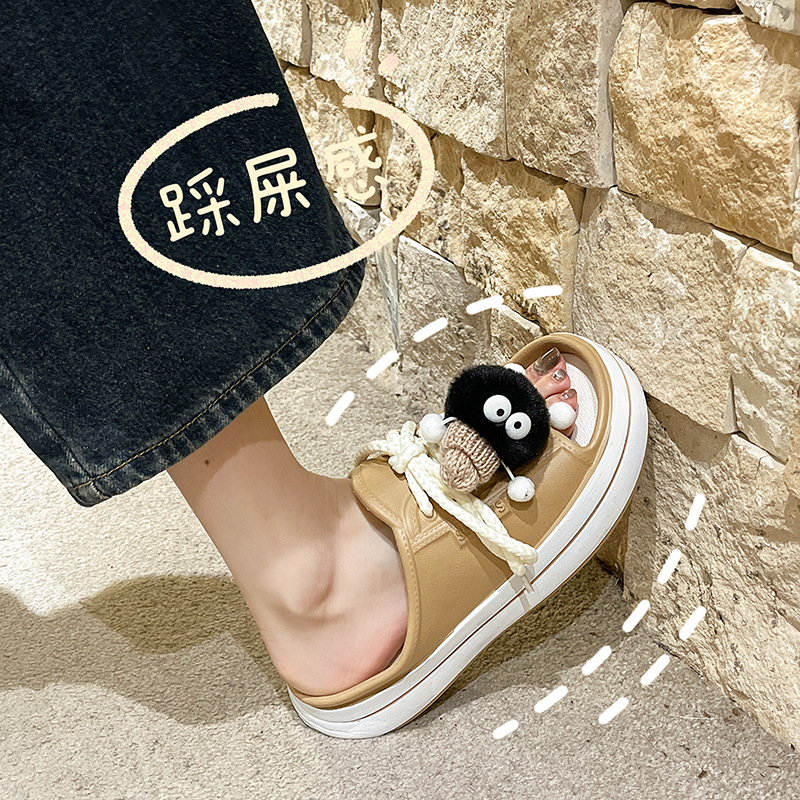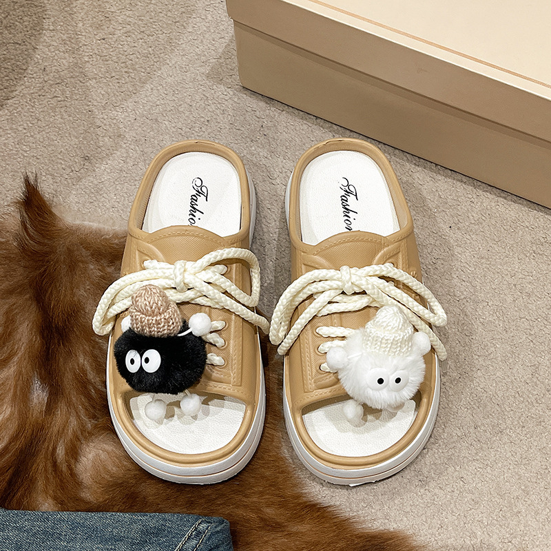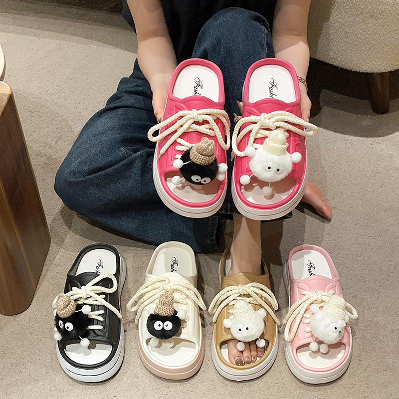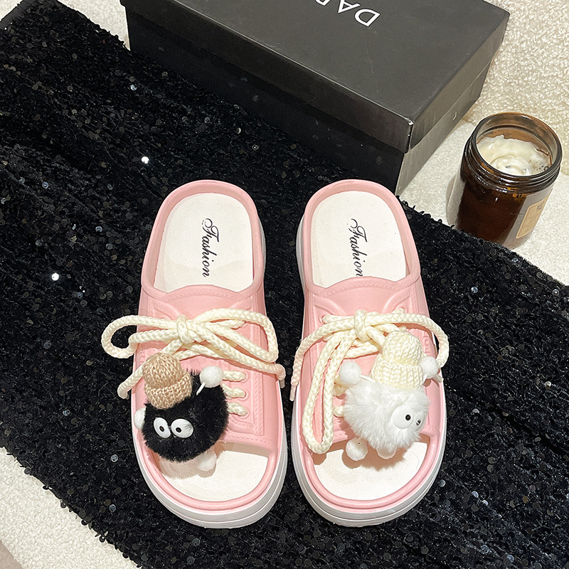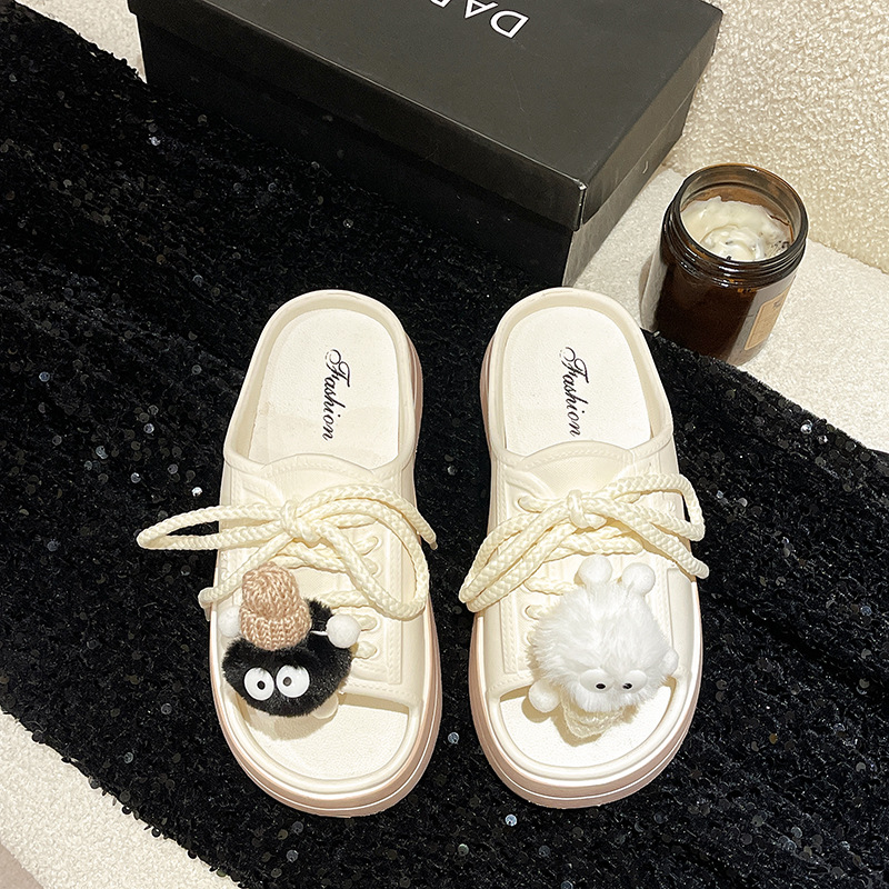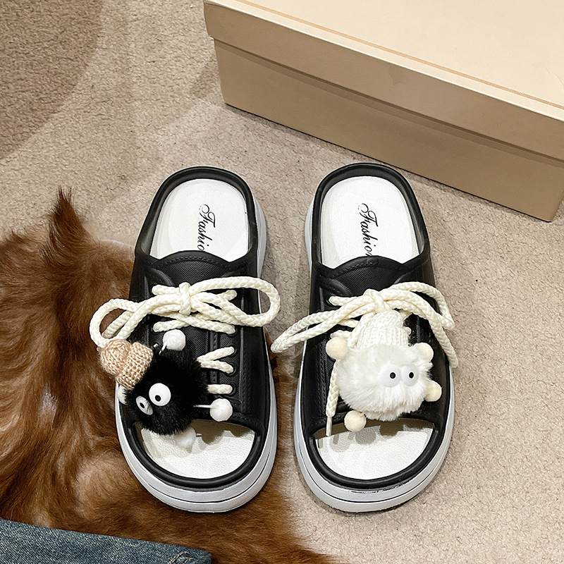 EVA卡通黑白毛绒煤球一字厚底拖鞋女经典绑带设计时尚百搭凉拖鞋