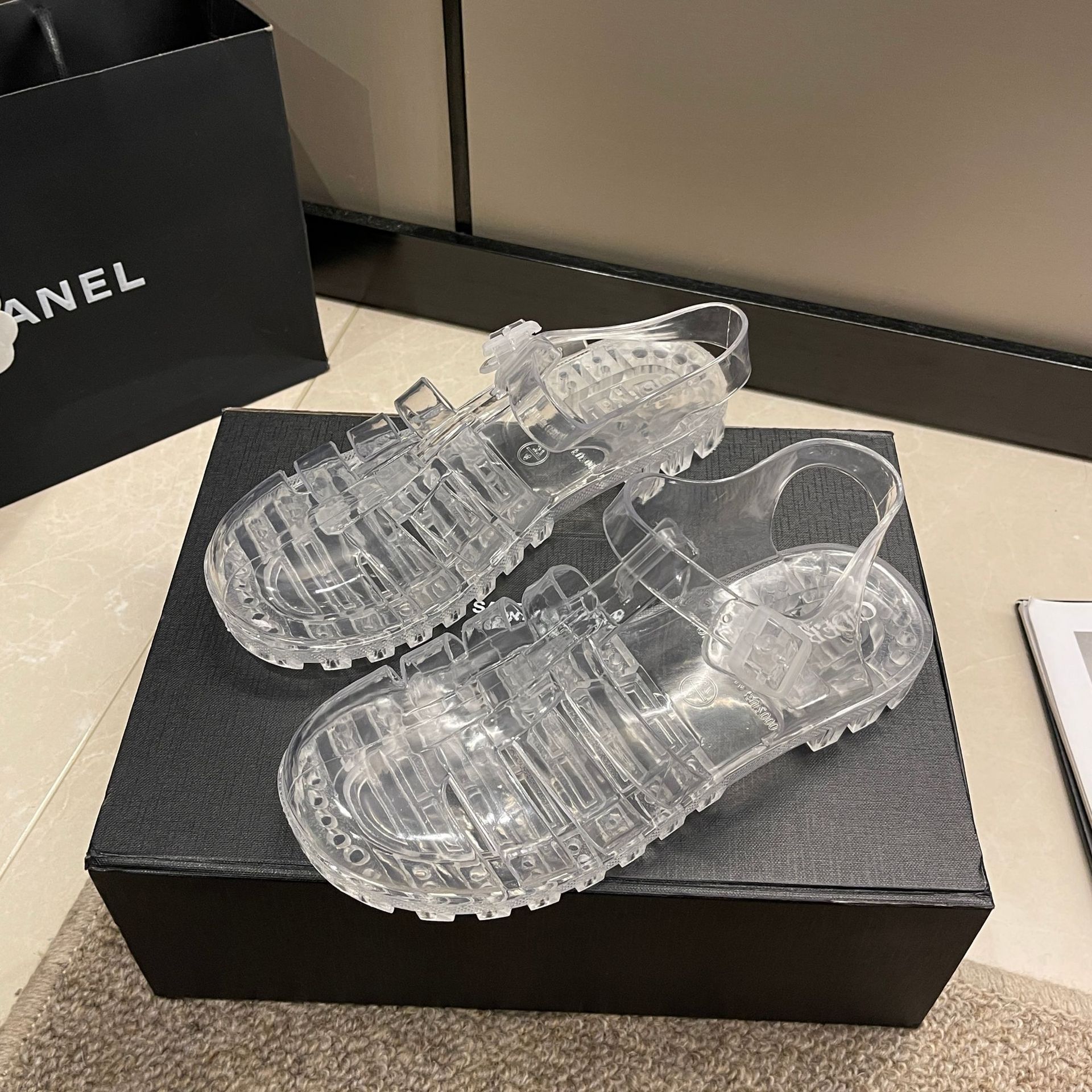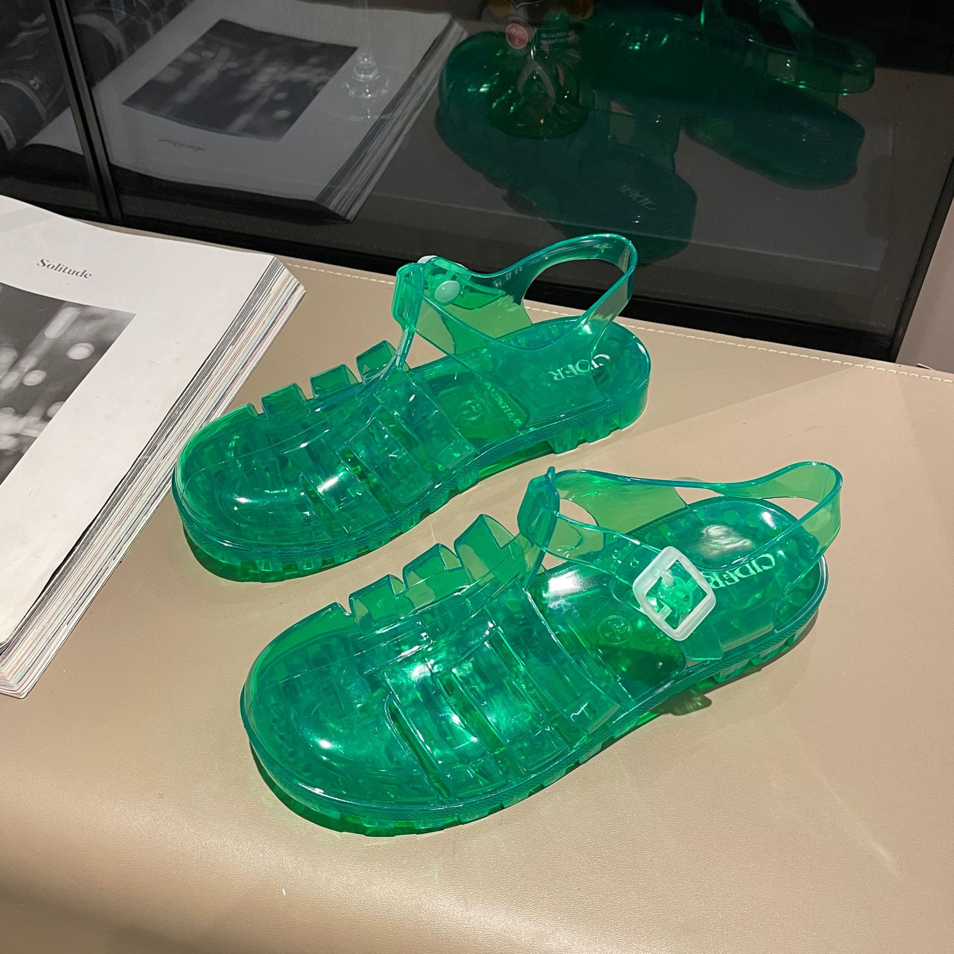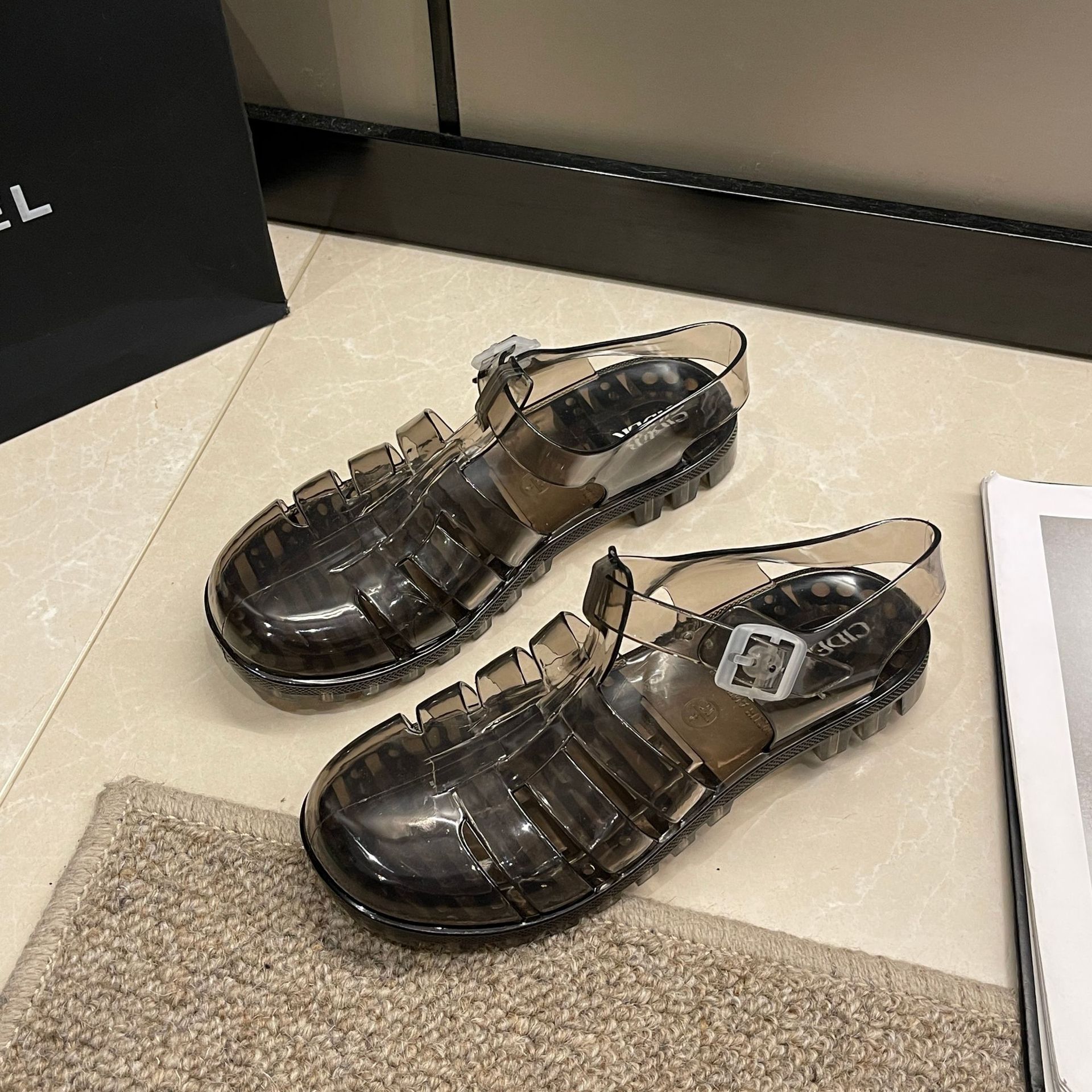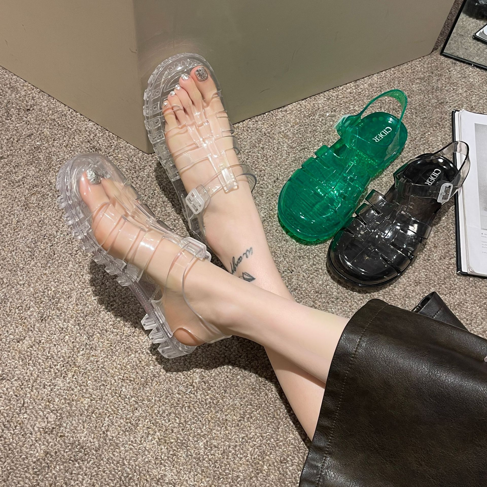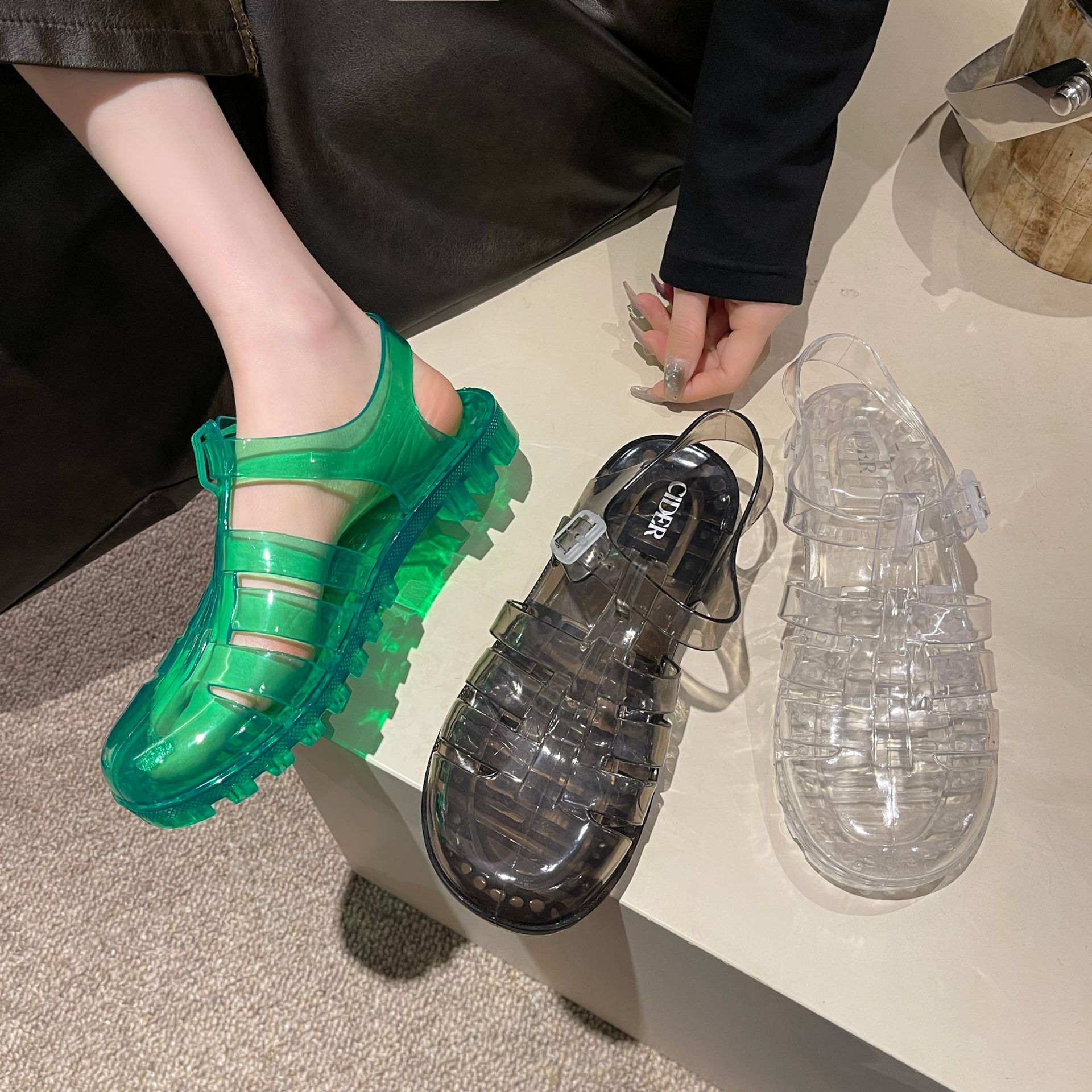 罗马凉鞋网红沙滩休闲包头凉拖鞋时尚欧美厚底搭扣女士水晶果冻鞋
