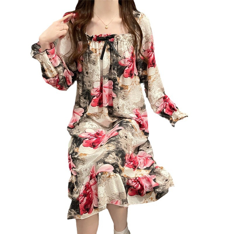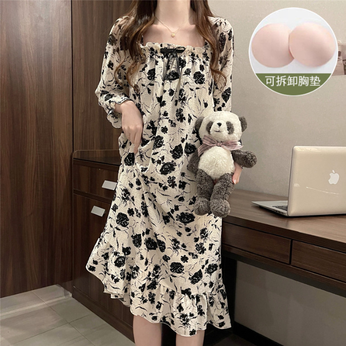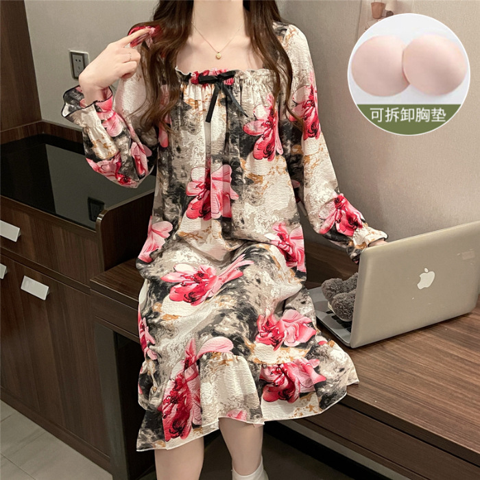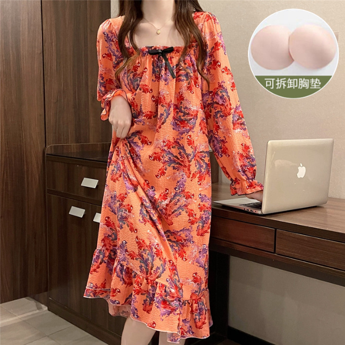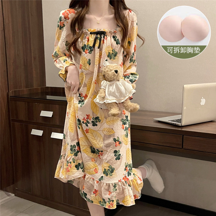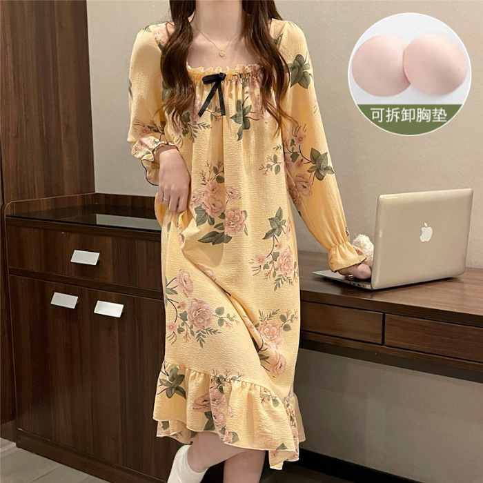 春秋季带胸垫长袖睡裙女气质花卉梭织棉泡泡皱布睡衣中长款连衣裙