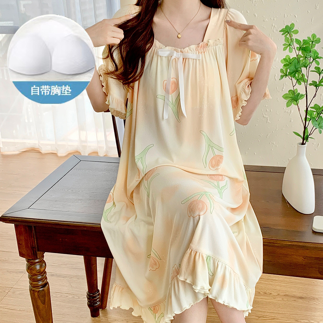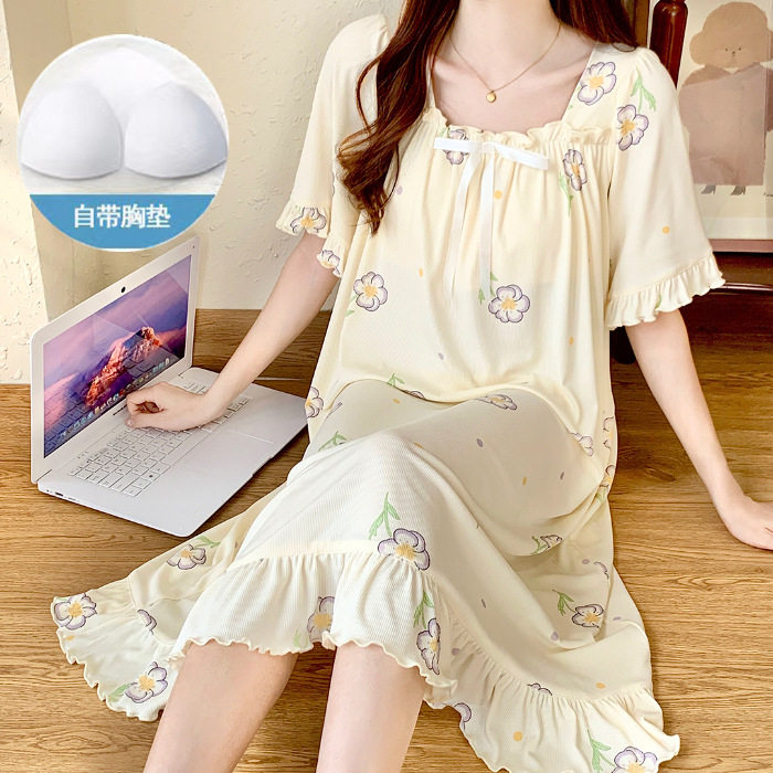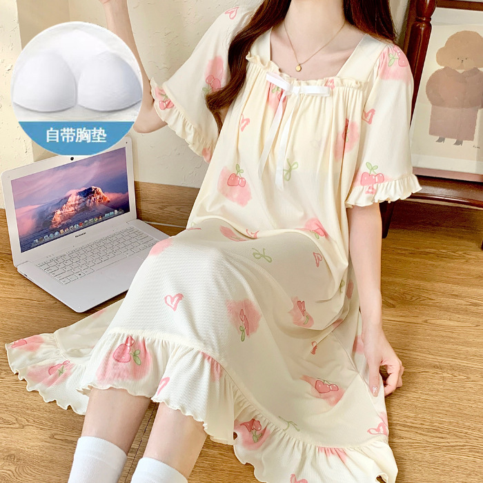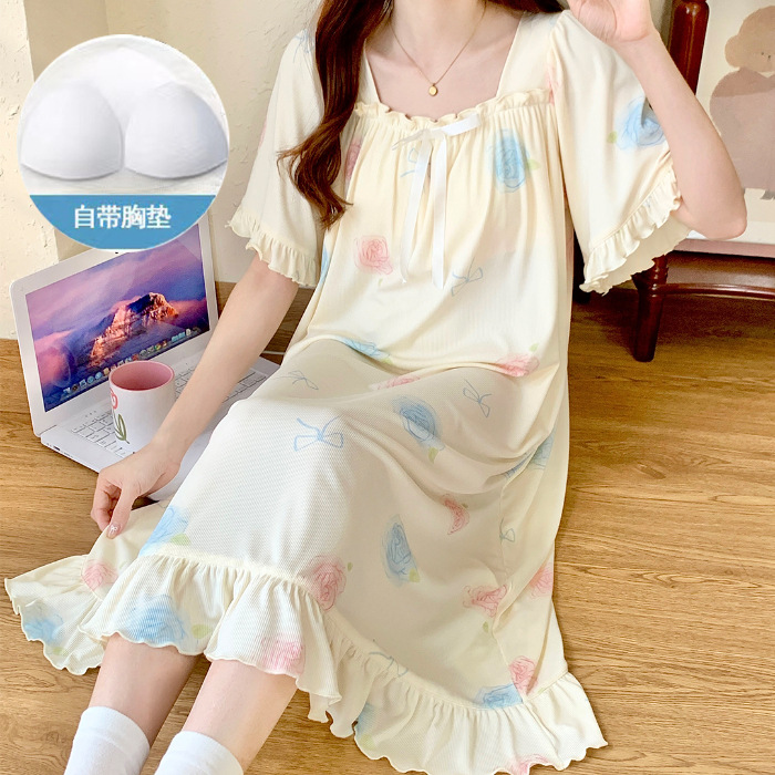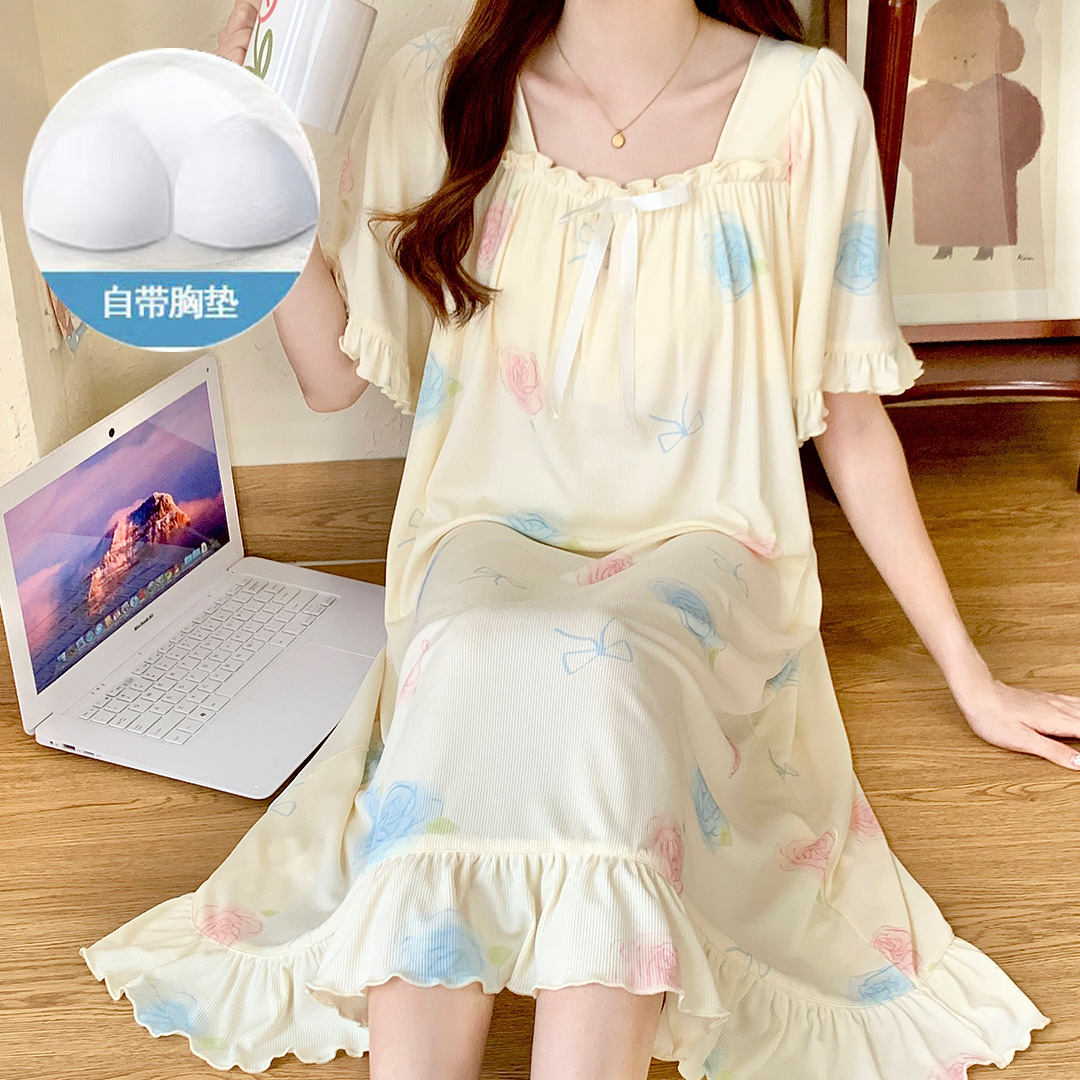 新品带胸垫睡衣裙女夏季甜美方领学生高颜值中长款连衣裙家居服