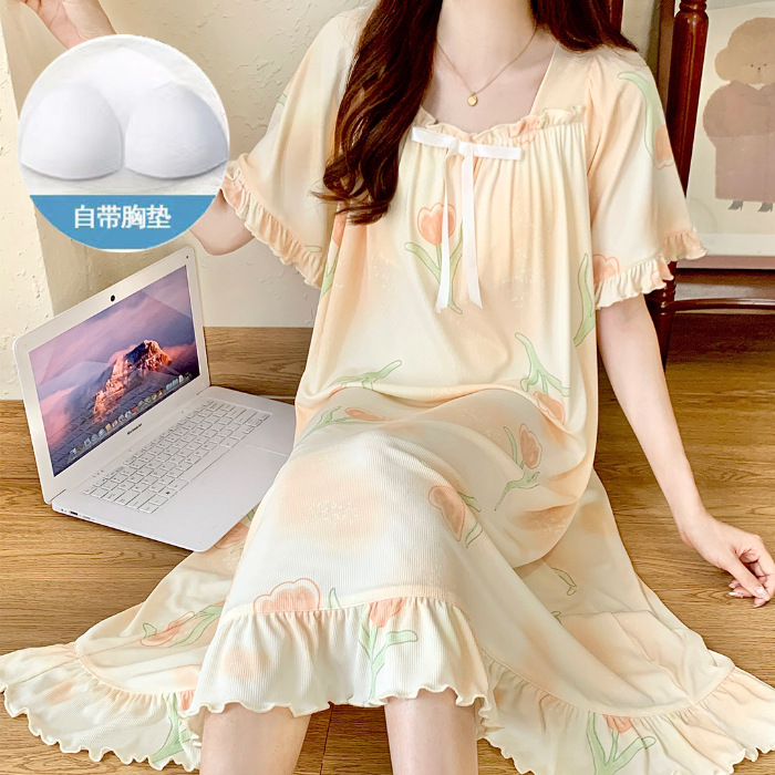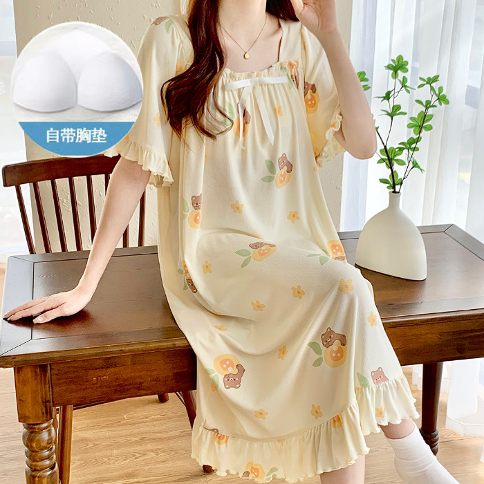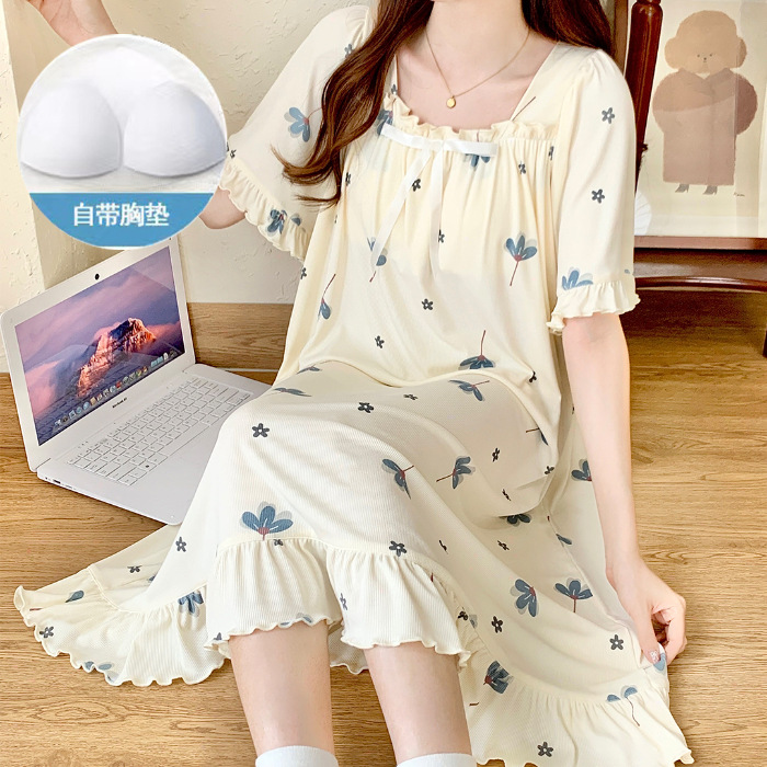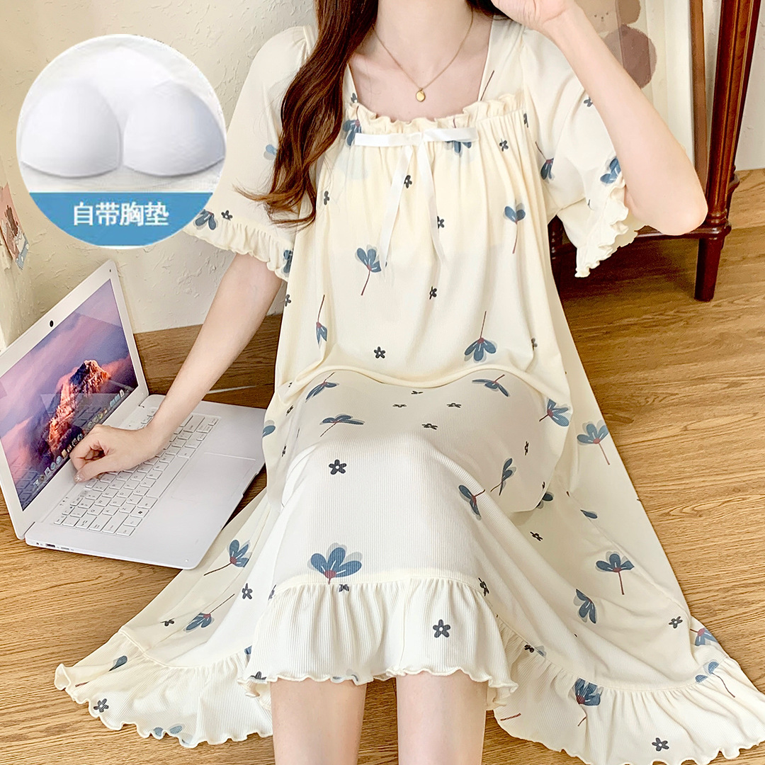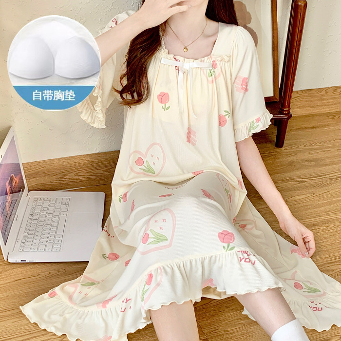 新品带胸垫睡衣裙女夏季甜美方领学生高颜值中长款连衣裙家居服