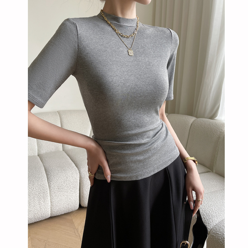 抖音爆款 莫代尔螺纹小圆领正肩短袖t恤女夏季修身半中袖女装上衣