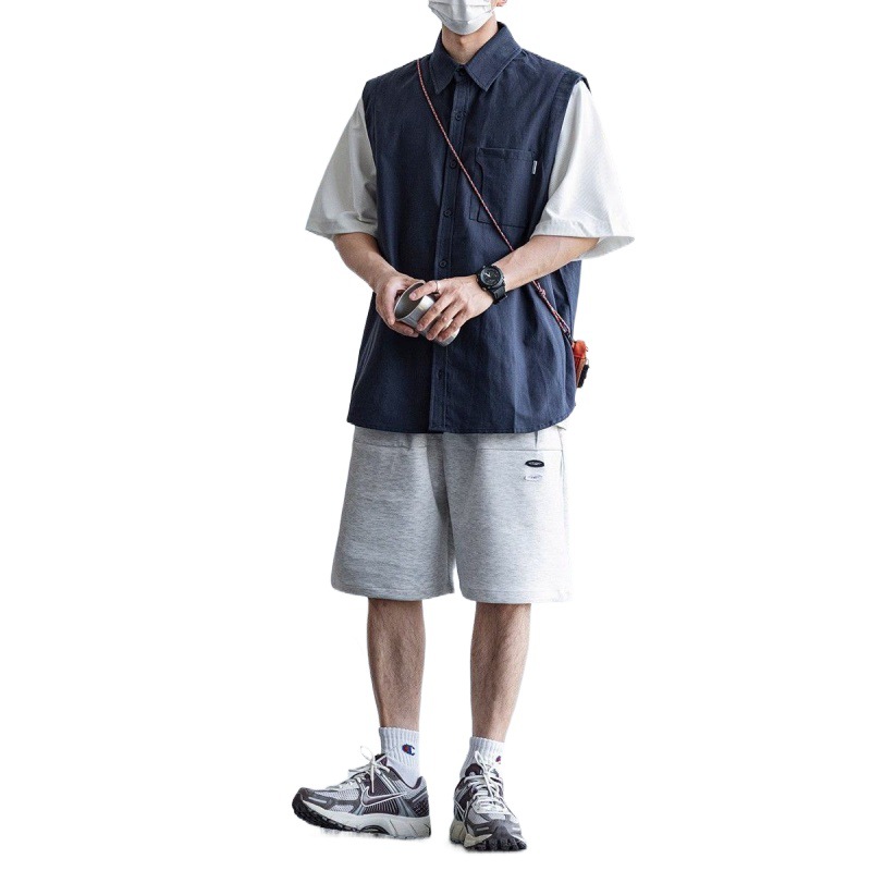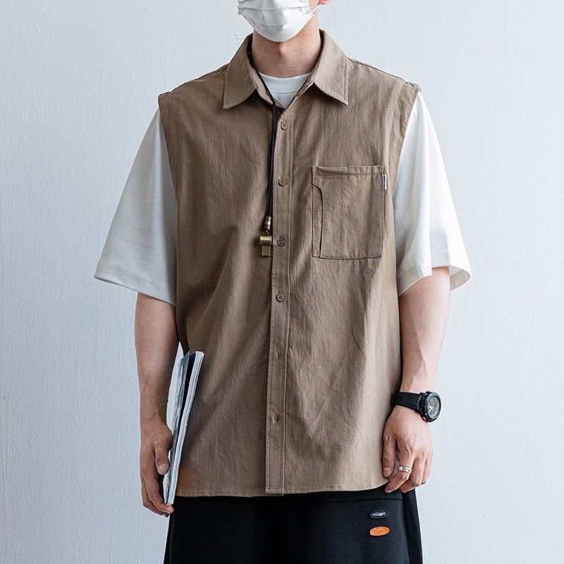 夏季日系复古假两件短袖衬衫男CityBoy休闲五分袖工装百