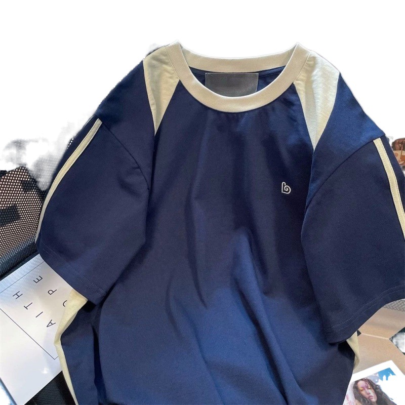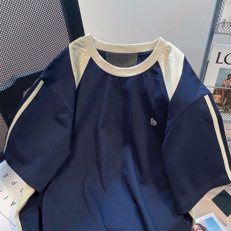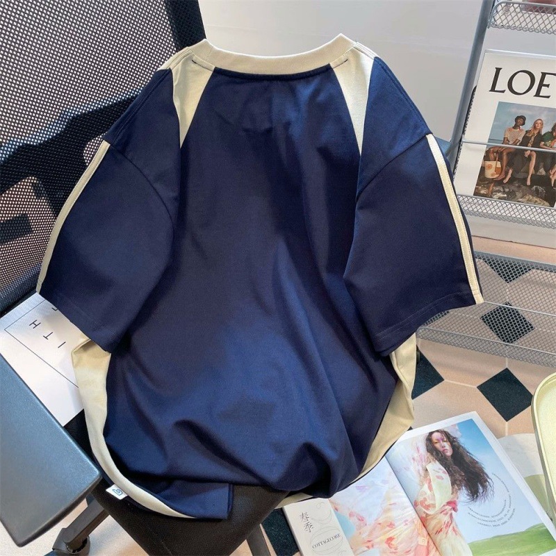 国潮感撞色拼接短袖T恤男女大码宽松美式复古学院情侣上