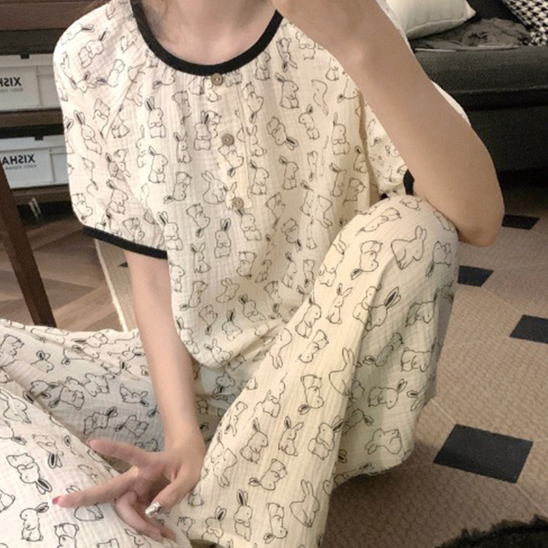 睡衣女夏季短袖长裤新款韩版简约可爱小兔子家居服两件套装