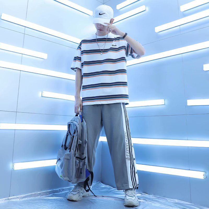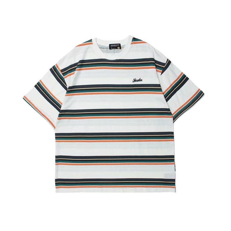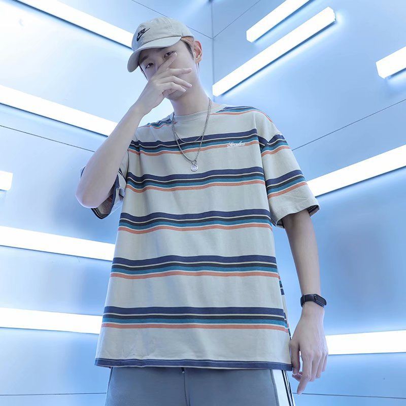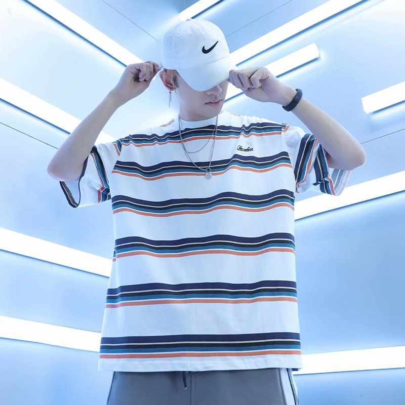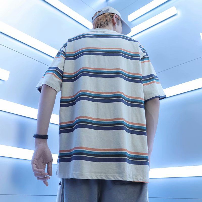 夏季日系复古条纹短袖T恤男女潮牌街头宽松bf风情侣休闲