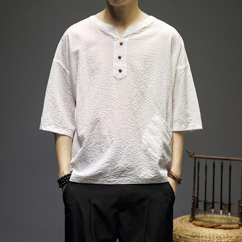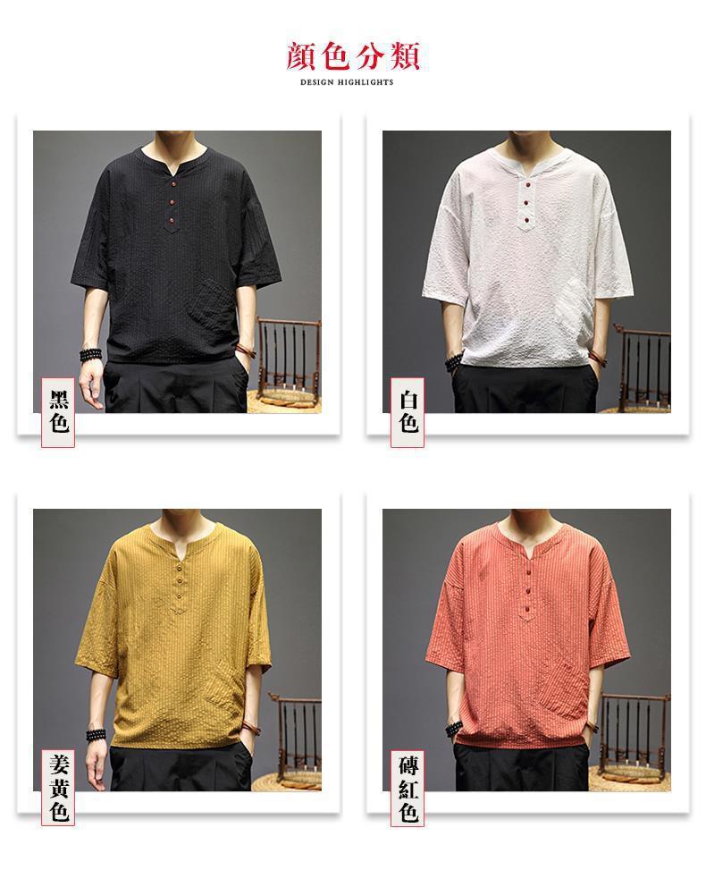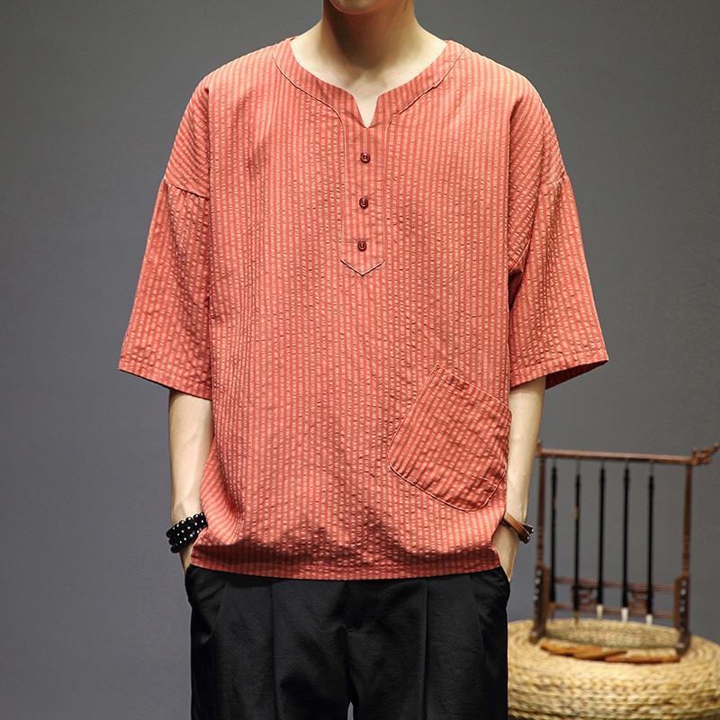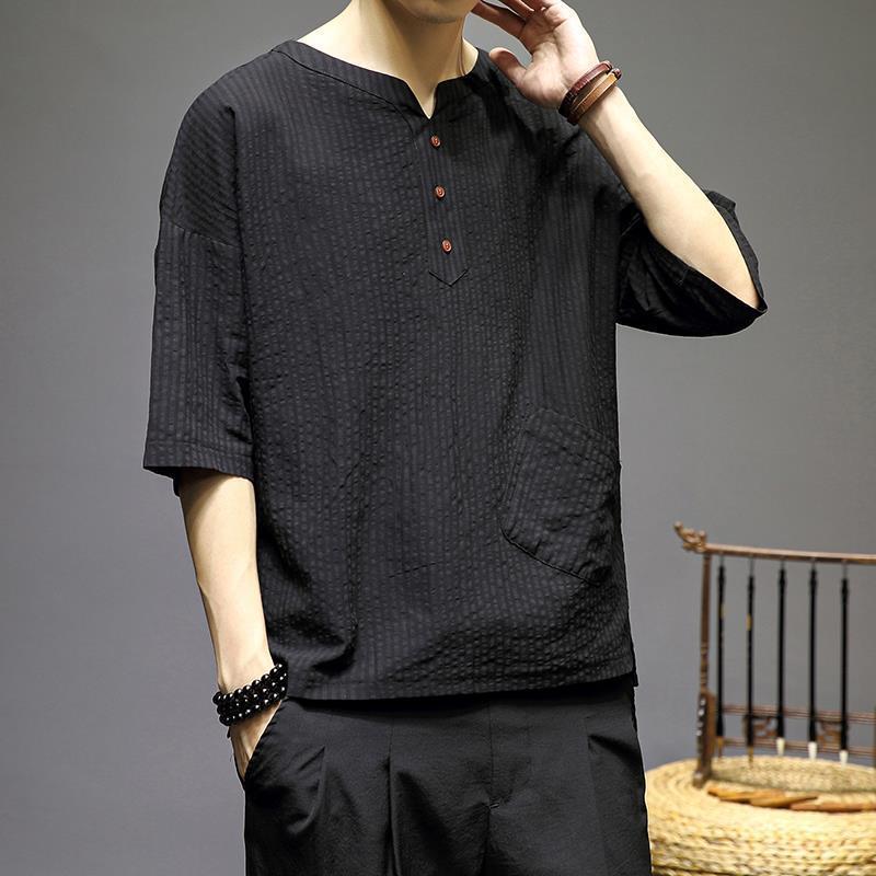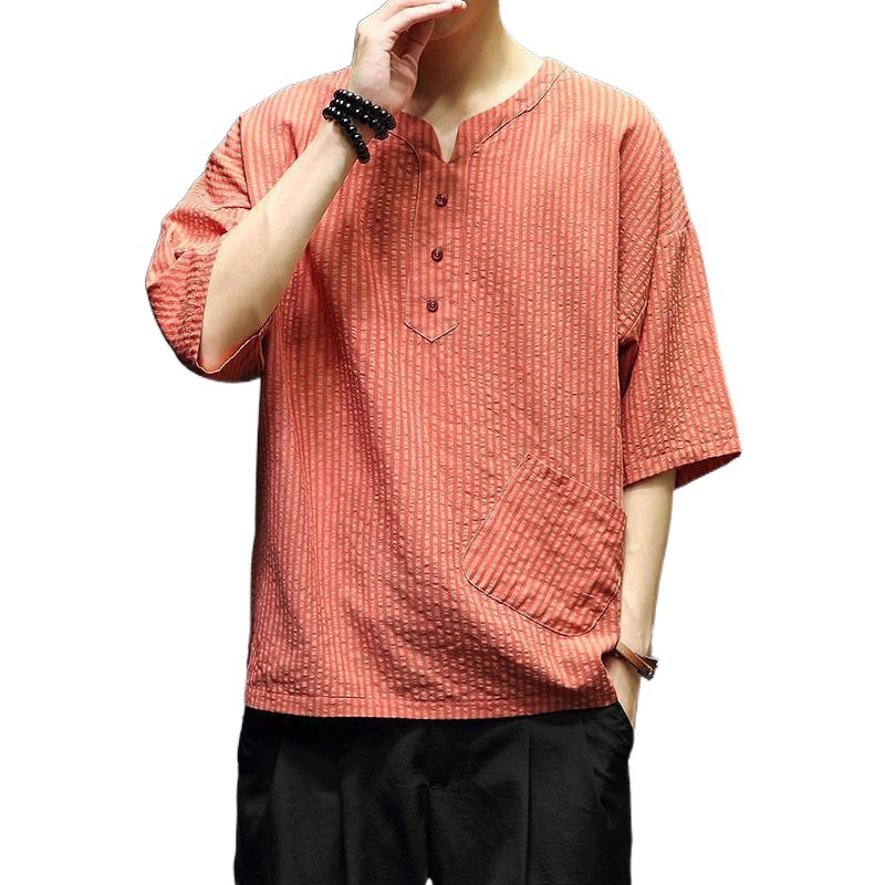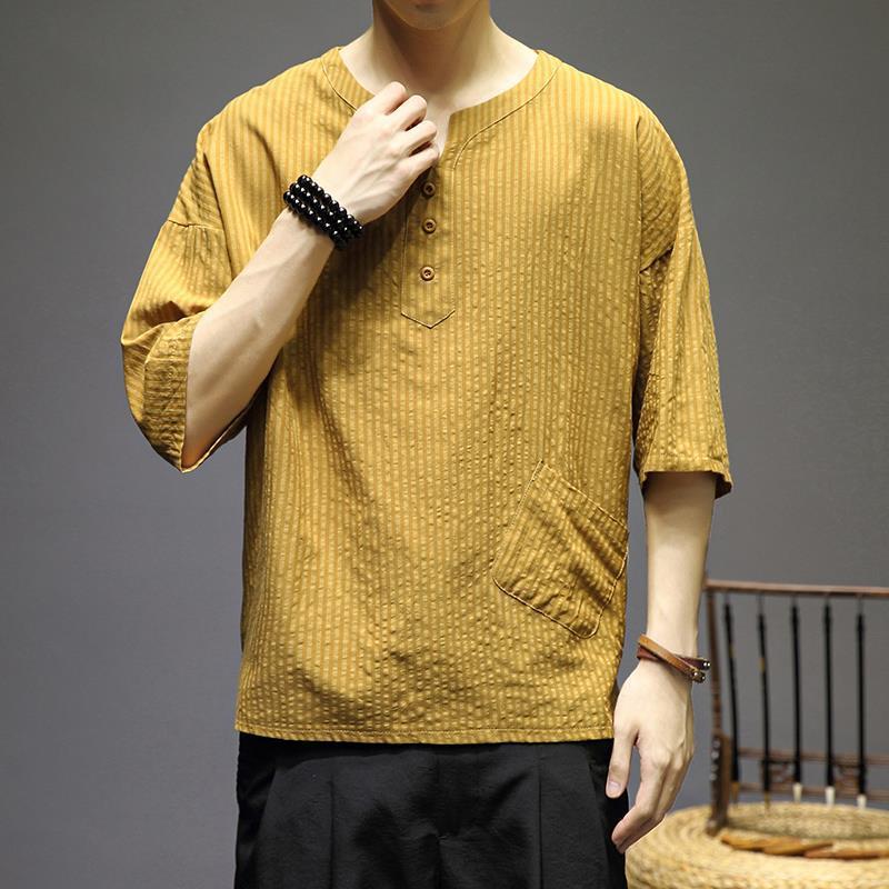 风棉麻短袖T恤男宽松中式条纹上衣夏季民族居士茶禅汉服