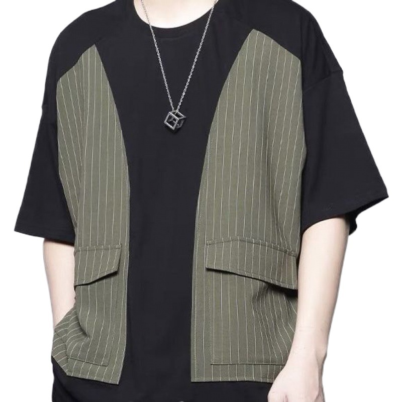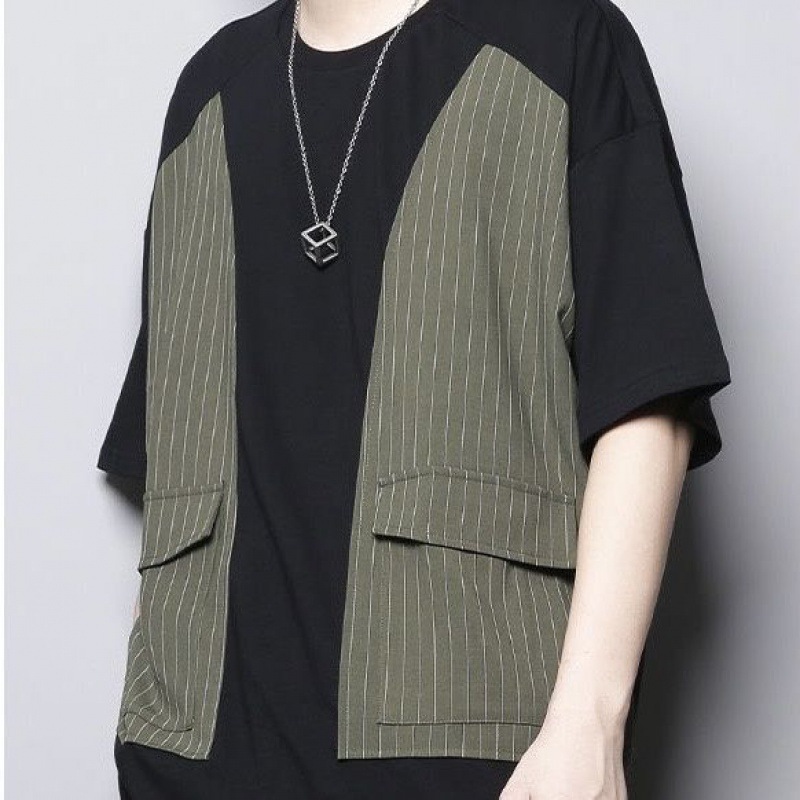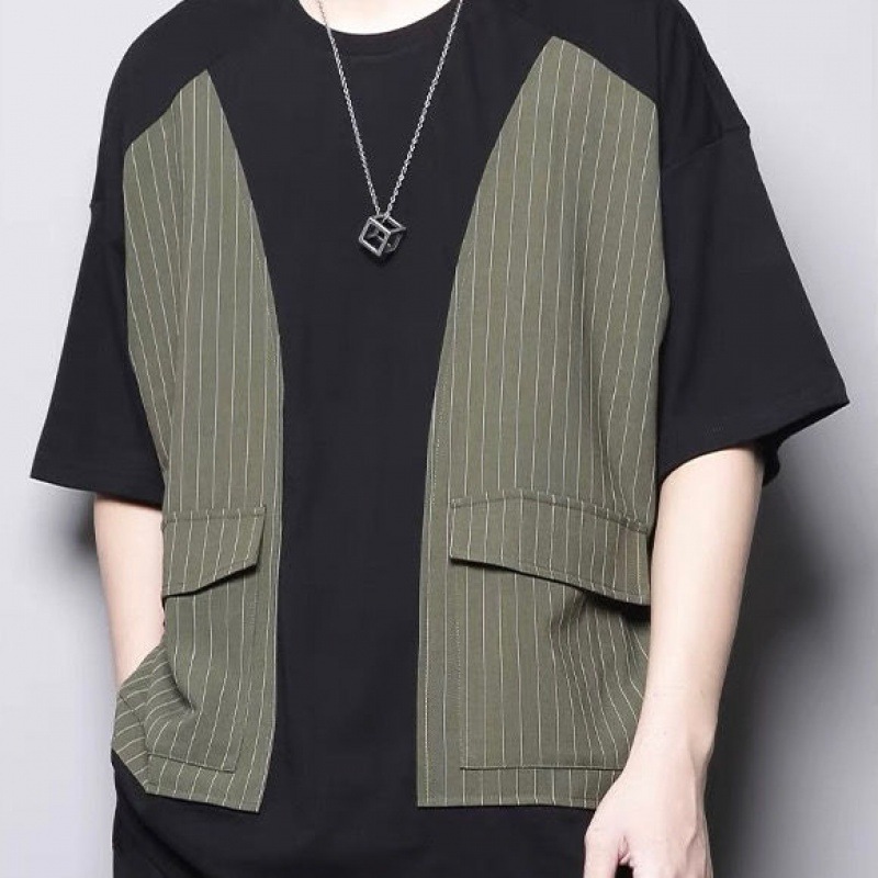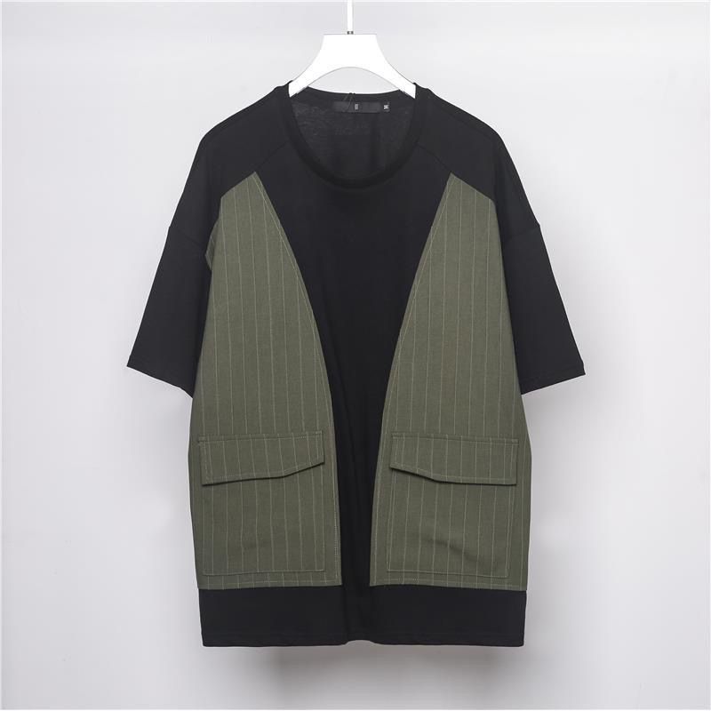 夏季新款条纹拼接口袋工装撞色拼接宽松圆领短袖T恤潮男