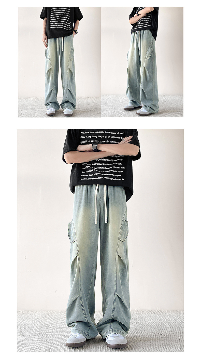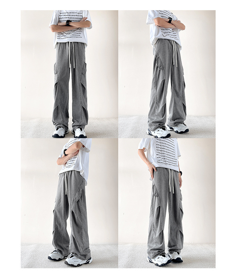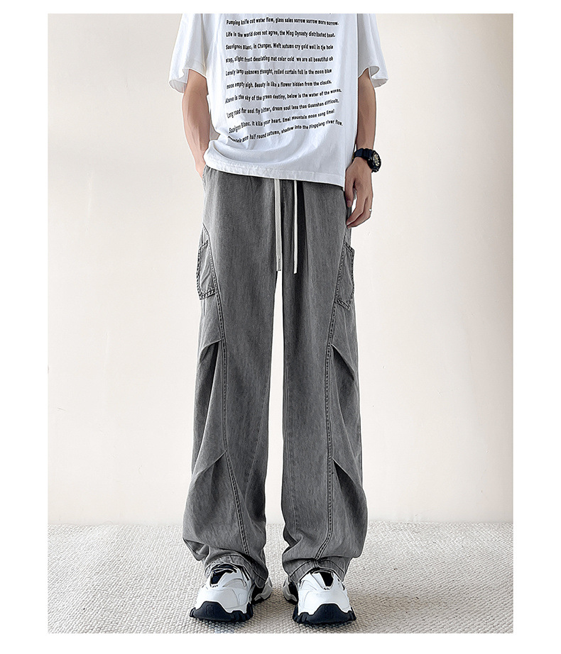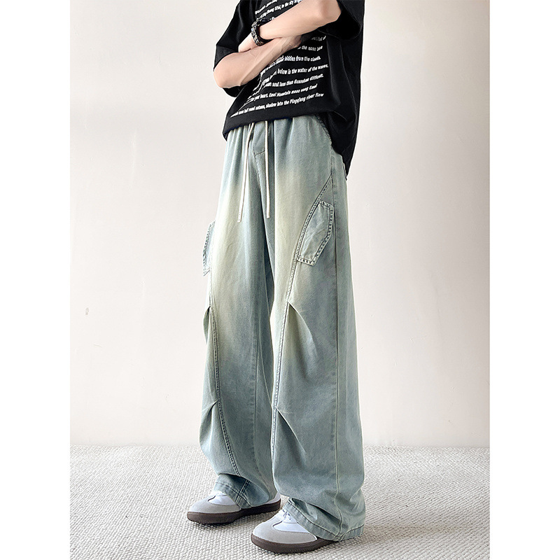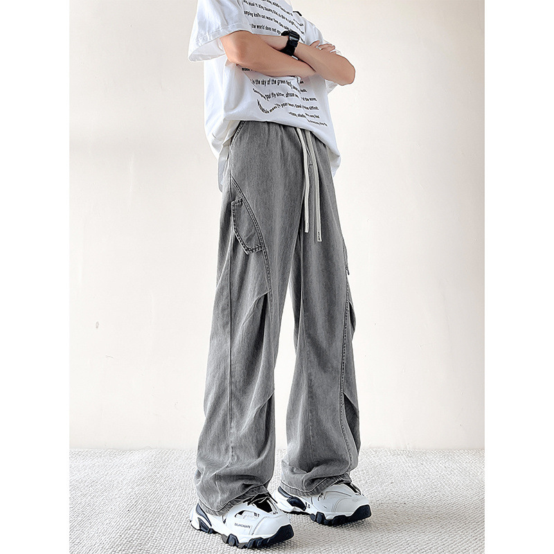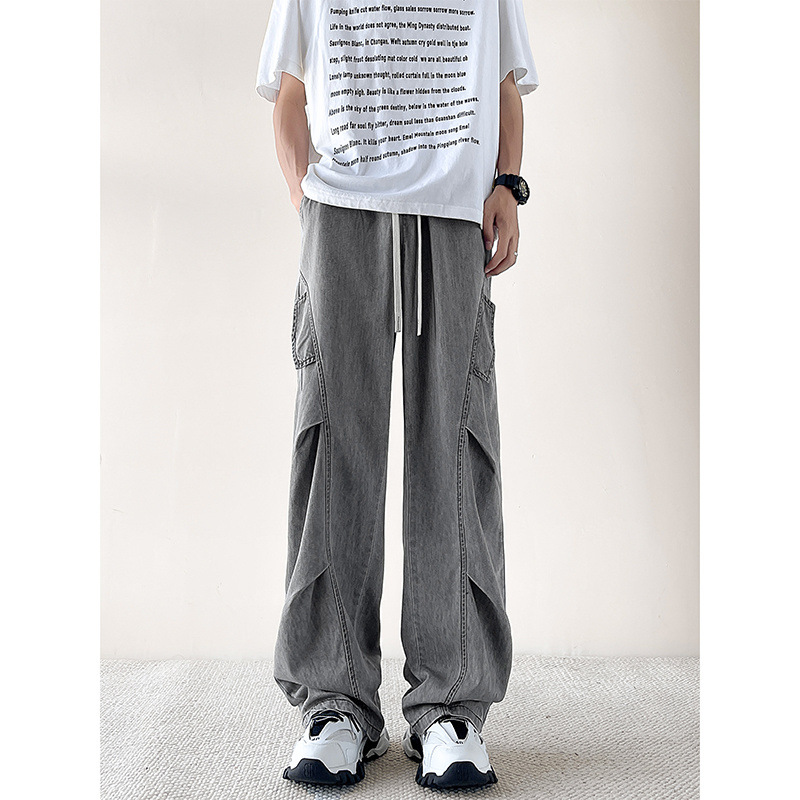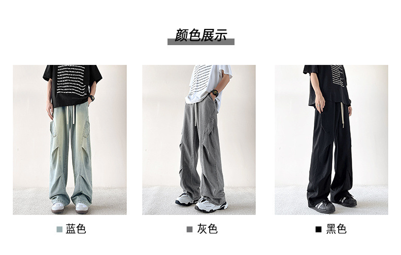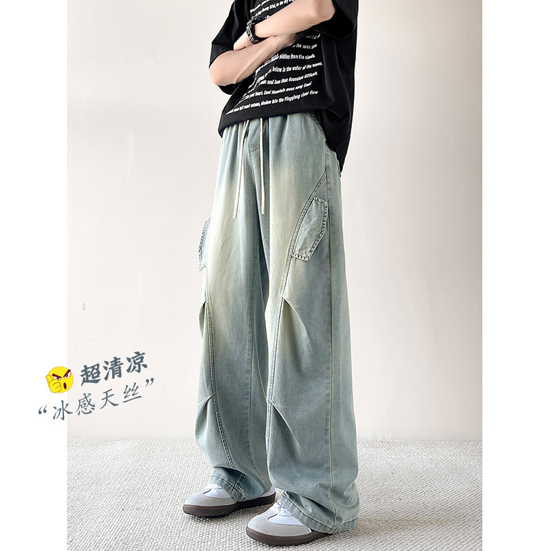冰丝牛仔裤男秋季薄款凉感褶皱工装裤美式高街宽松直筒松
