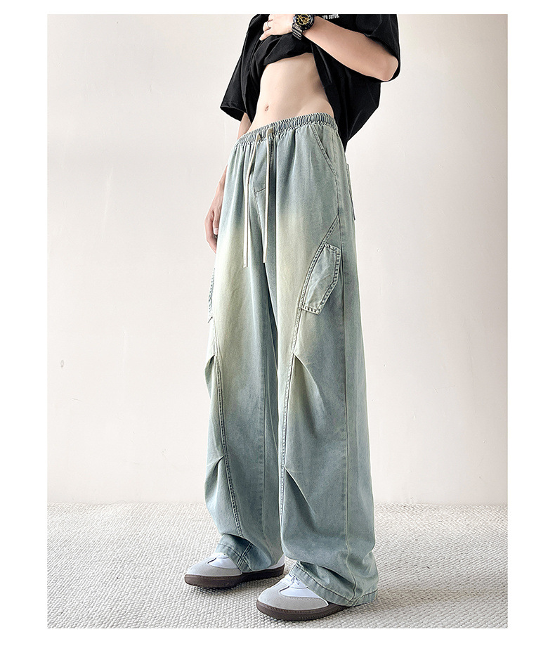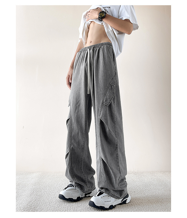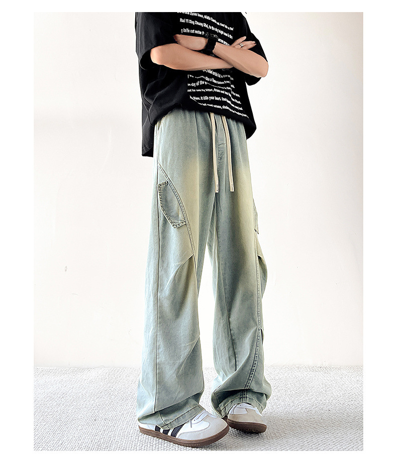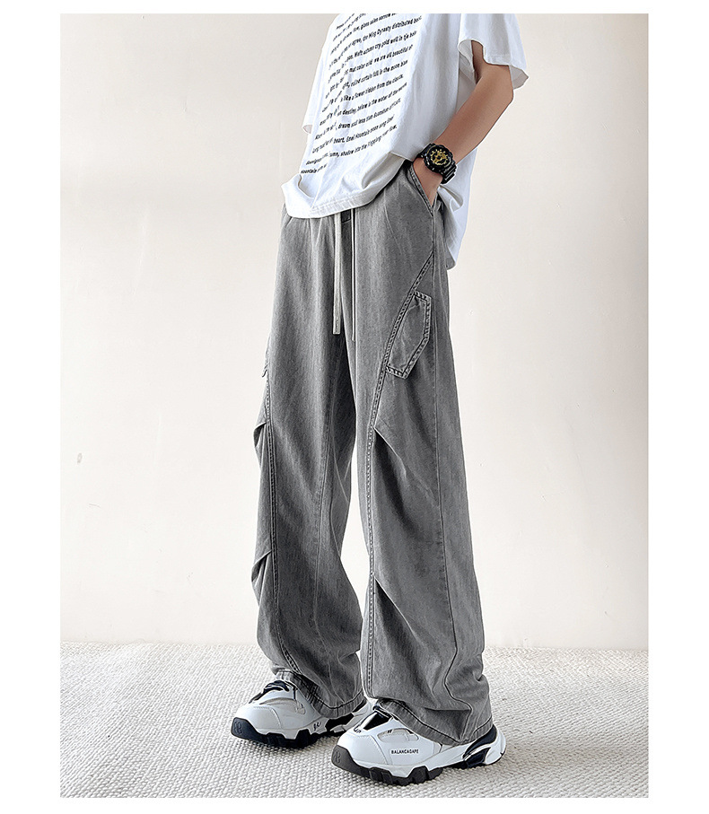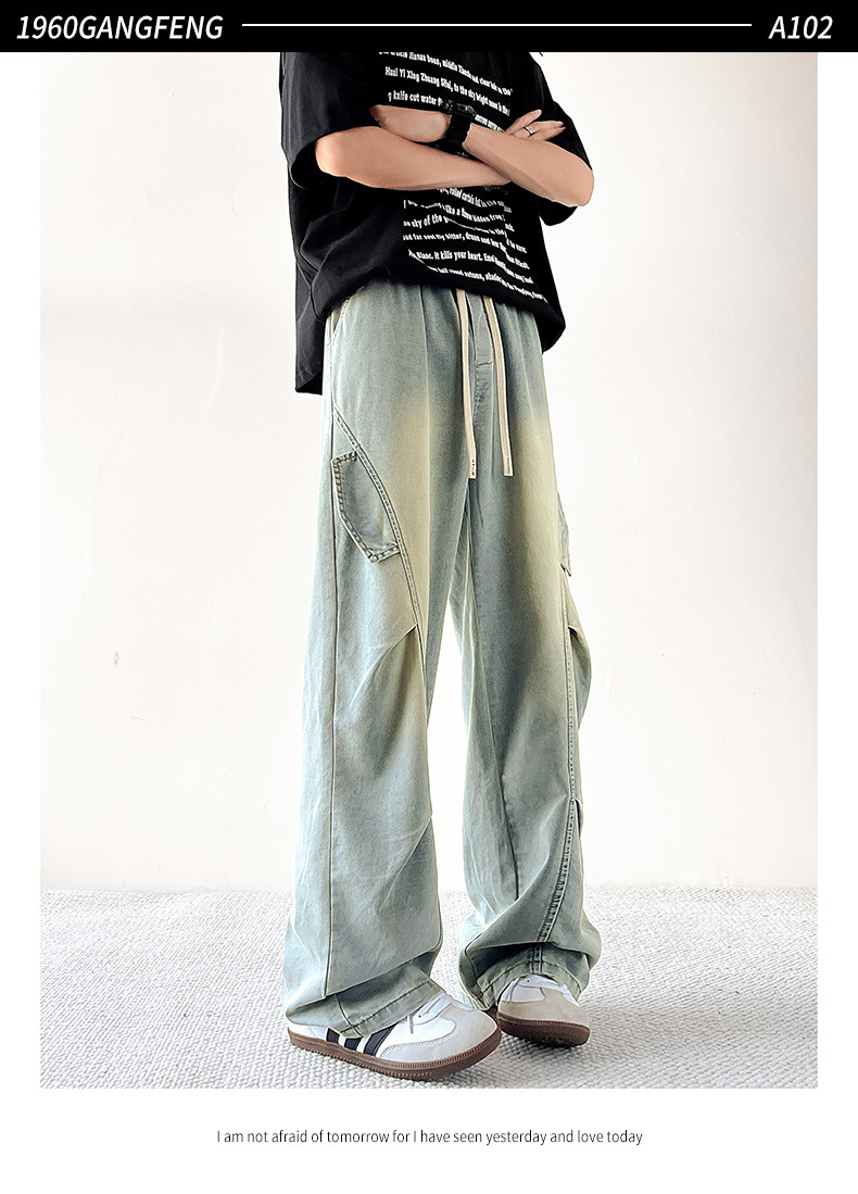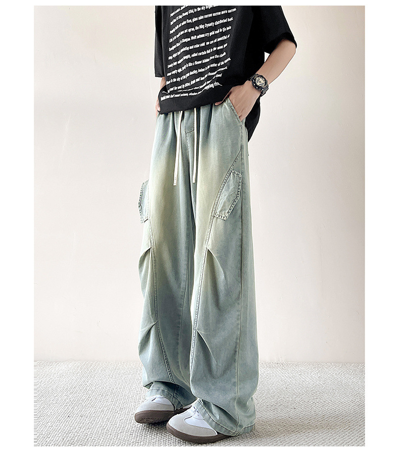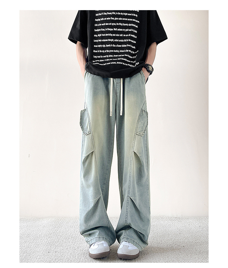 冰丝牛仔裤男秋季薄款凉感褶皱工装裤美式高街宽松直筒松