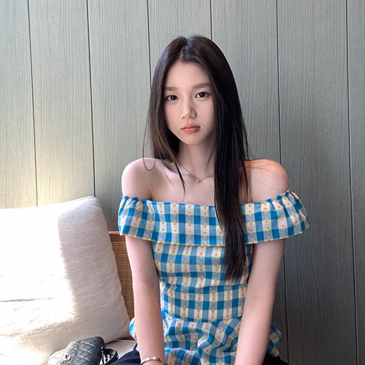 蓝色格纹一字领衬衫女2025夏季新款荷叶边露肩上衣