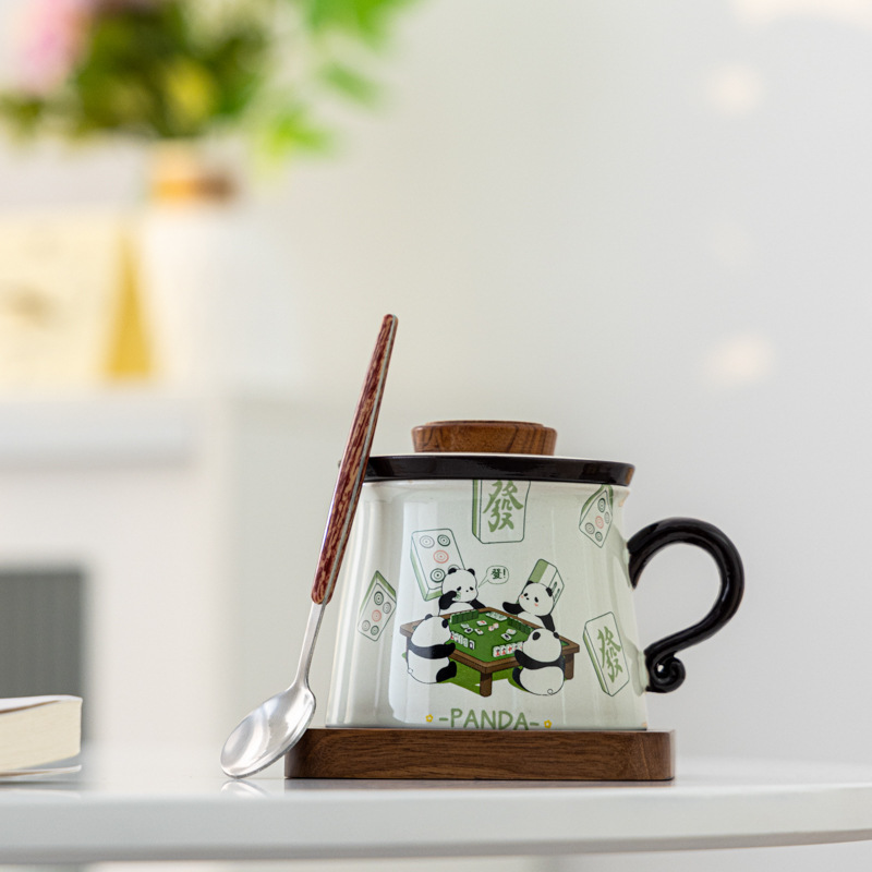 熊猫打麻将草木灰咖啡杯茶水分离陶瓷杯马克杯茶咖杯礼盒装