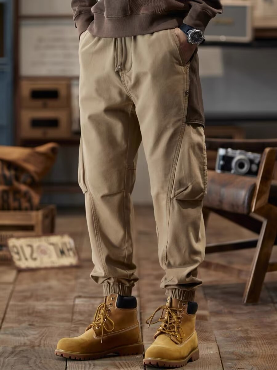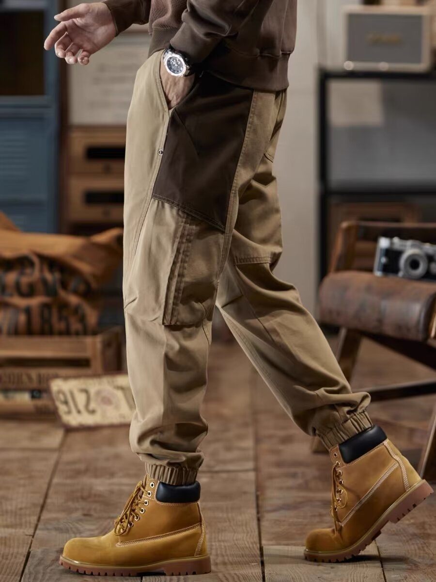 美式复古工装裤男春秋宽松束脚潮牌拼接裤子新款休闲男裤大码