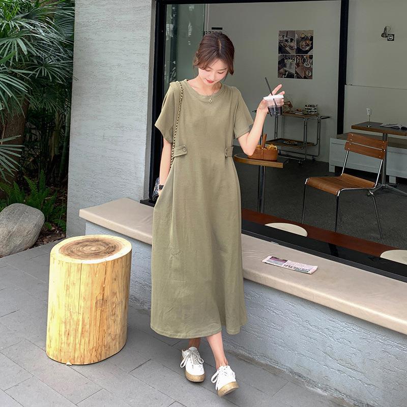 实拍ins宽松显瘦休闲风圆领T恤裙腰部拼接袢扣设计显白绿色连衣裙