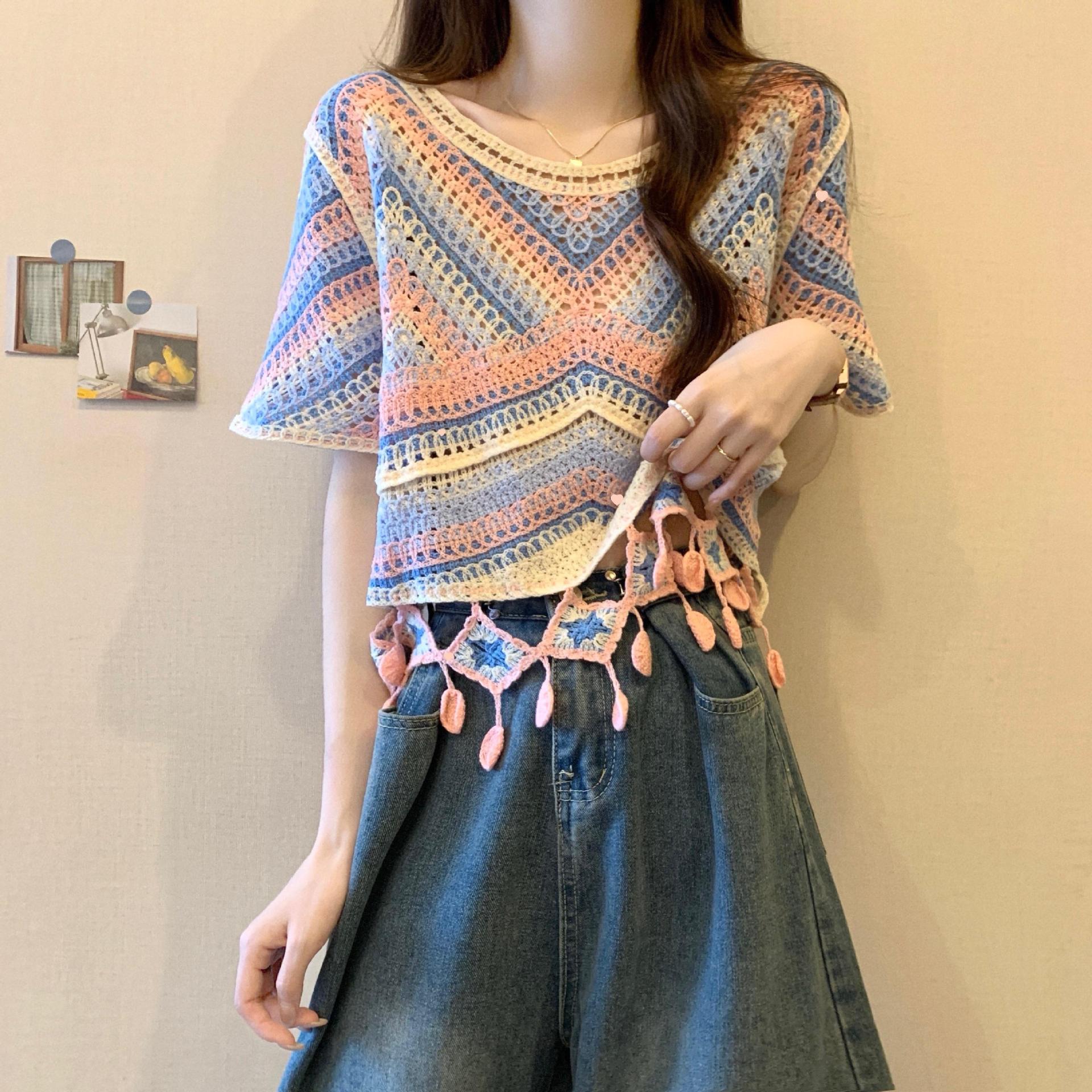 多巴胺夏季刺绣民族风泰式流苏针织衫冰丝波西米亚镂空短款上衣女