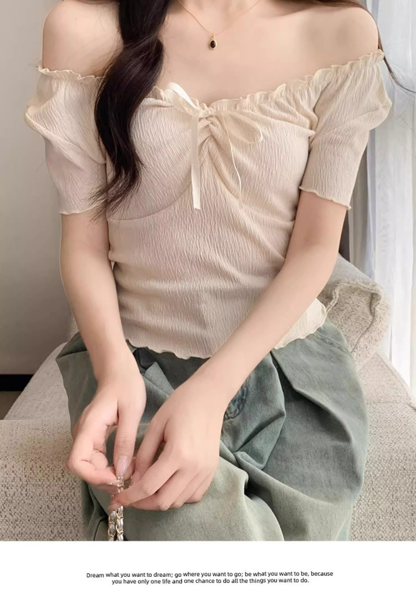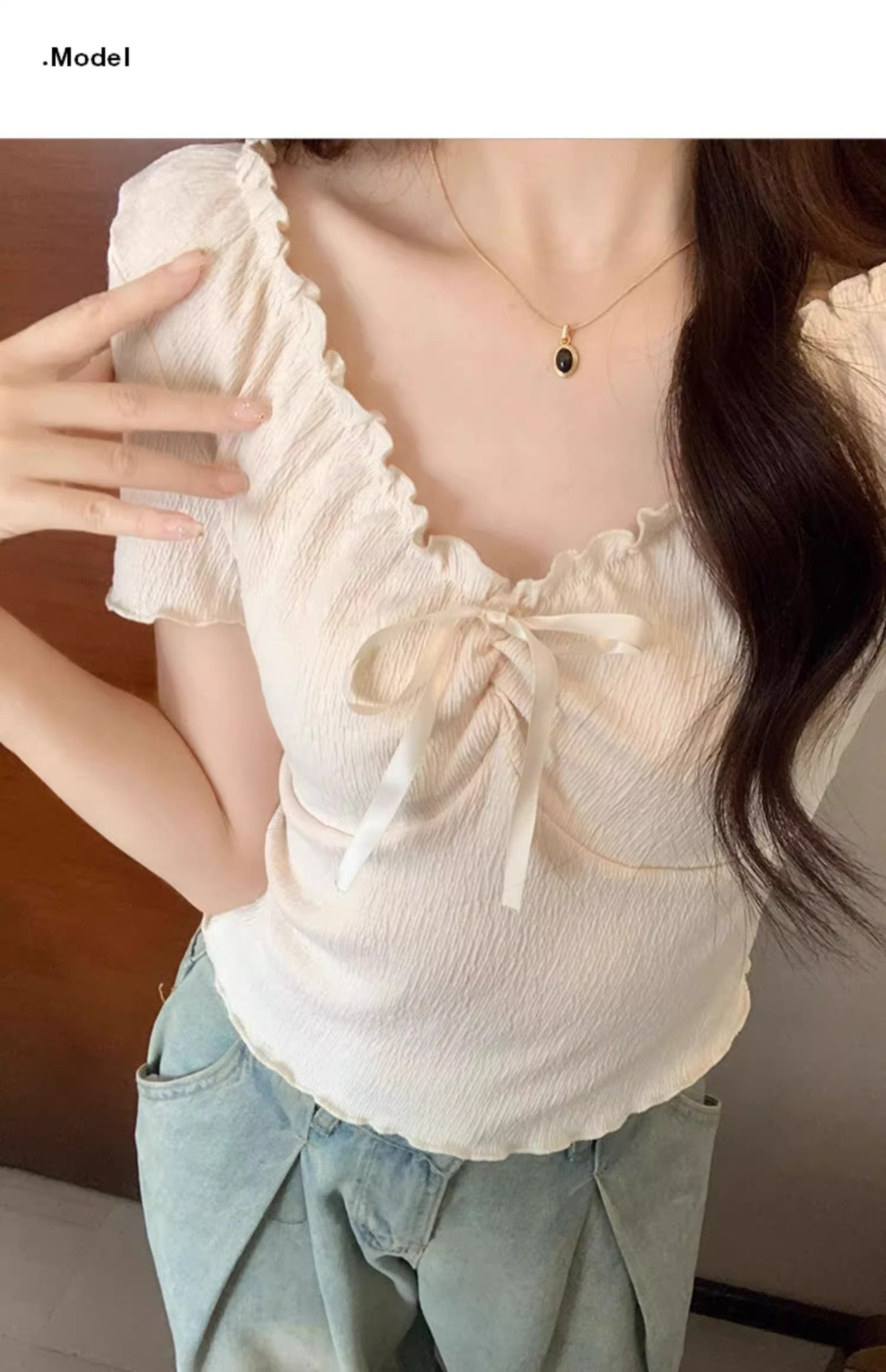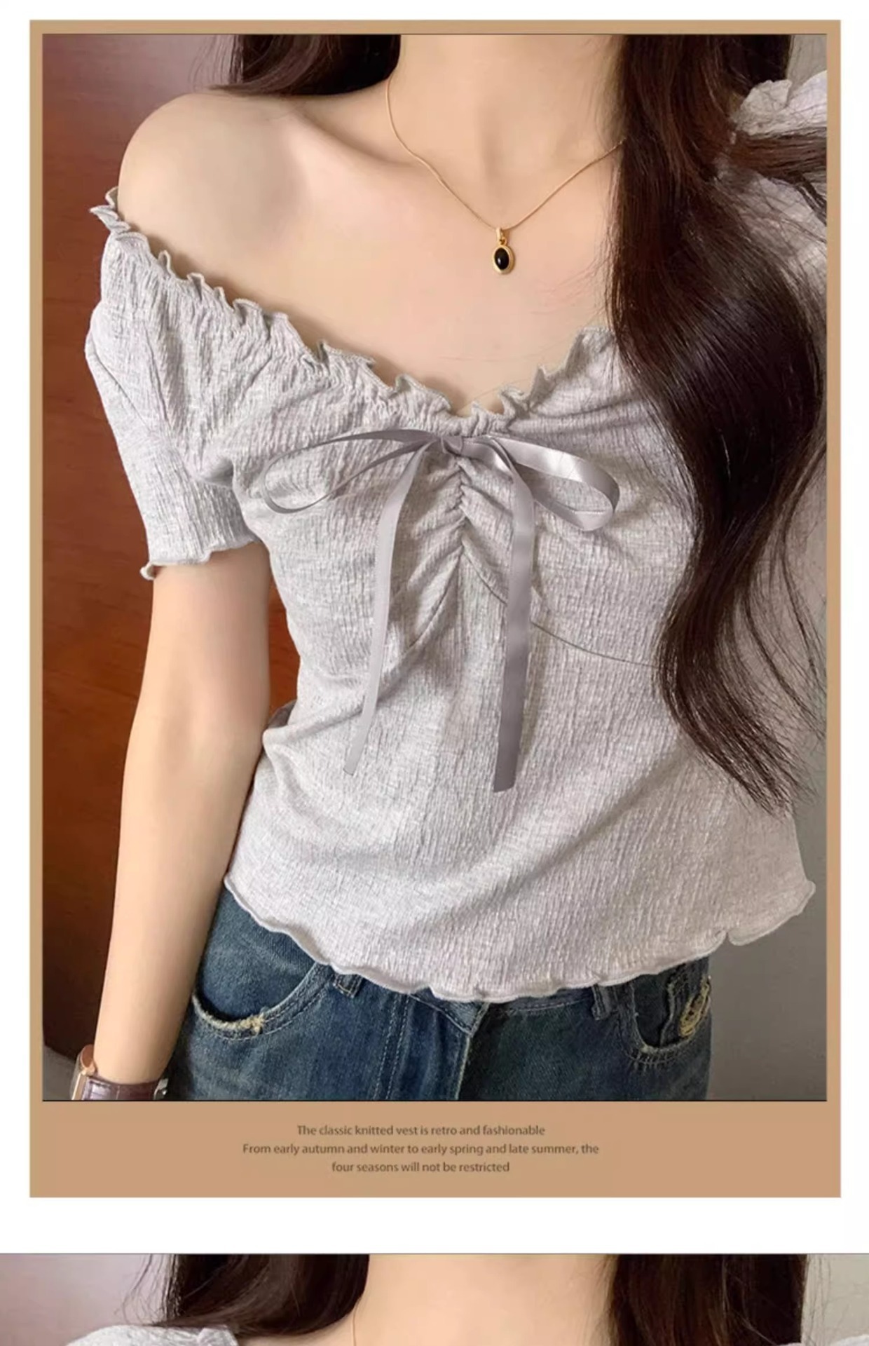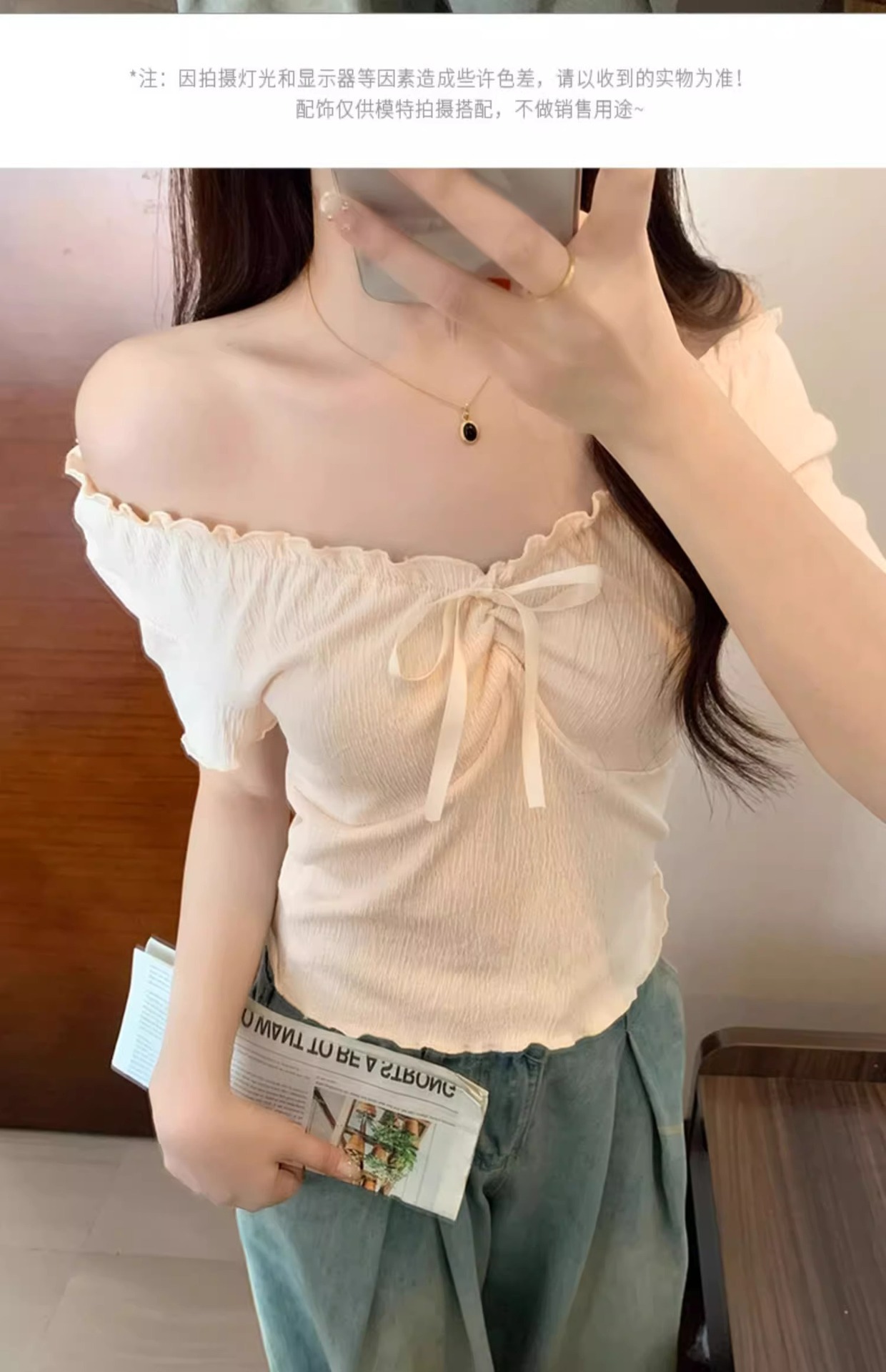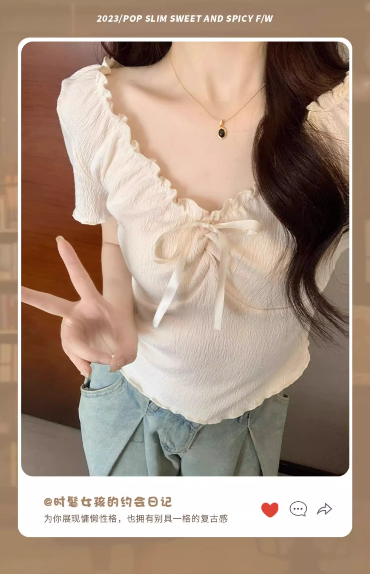 亿涵梦多种穿法设计感别致木耳边半袖短袖纯欲蕾丝花边修身上衣女