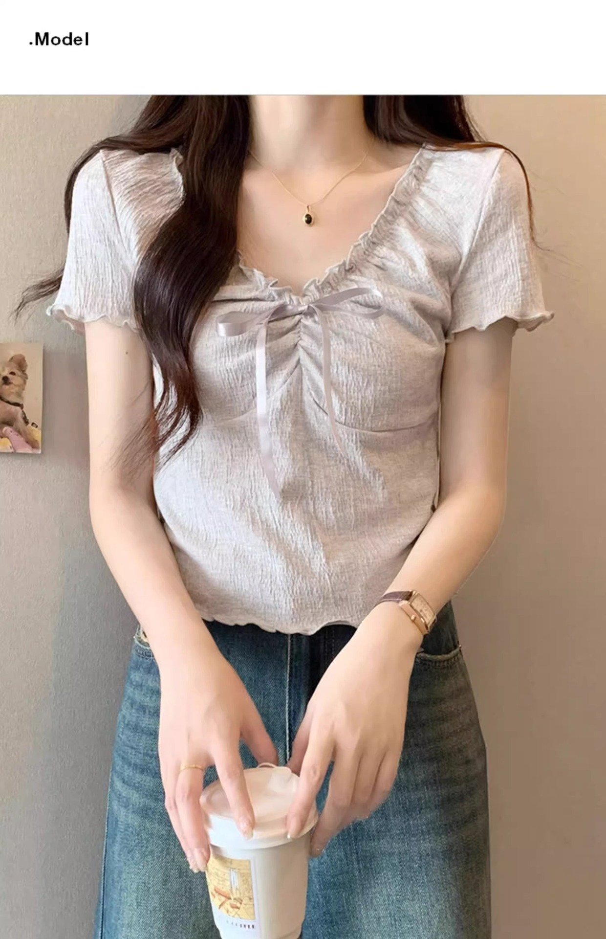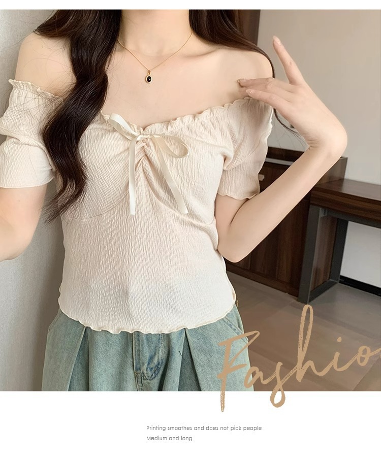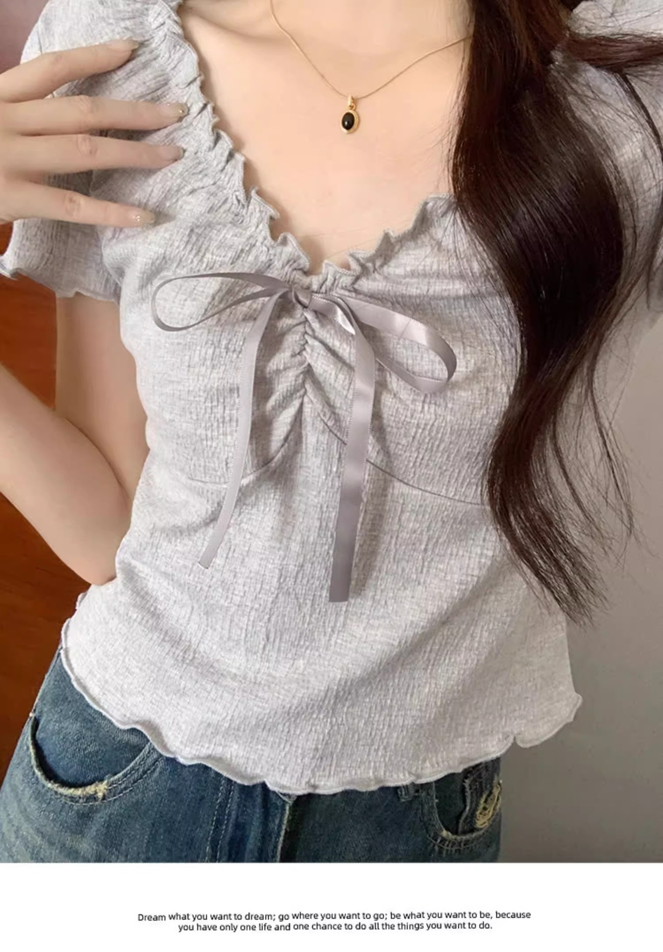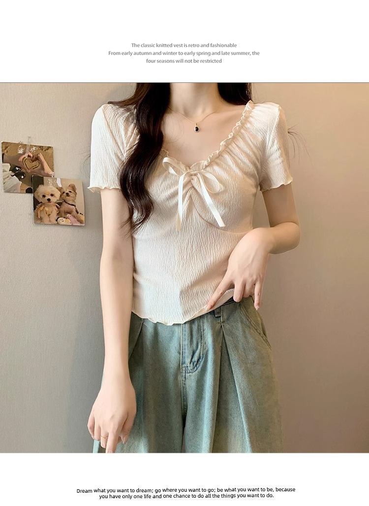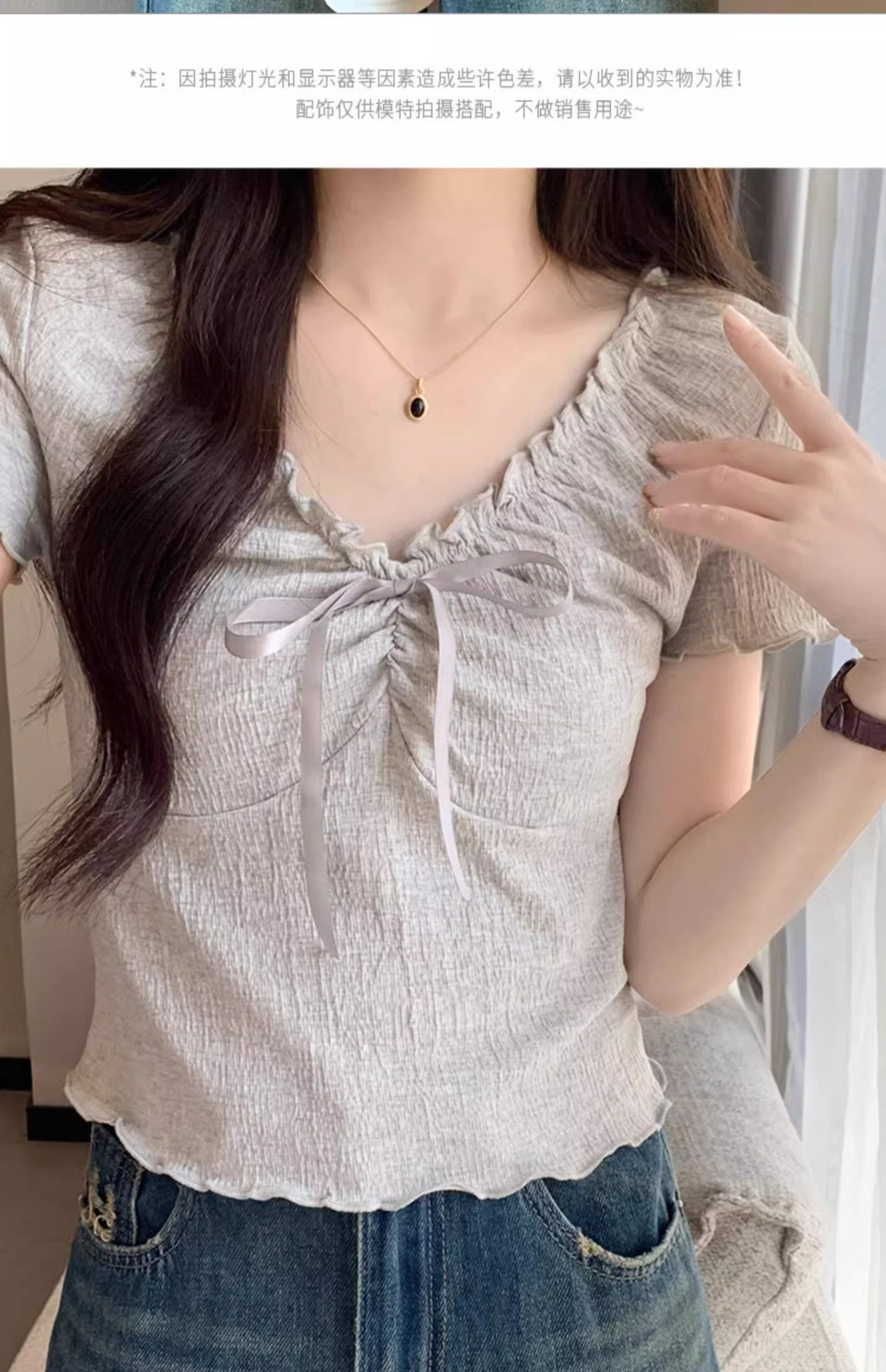 亿涵梦多种穿法设计感别致木耳边半袖短袖纯欲蕾丝花边修身上衣女