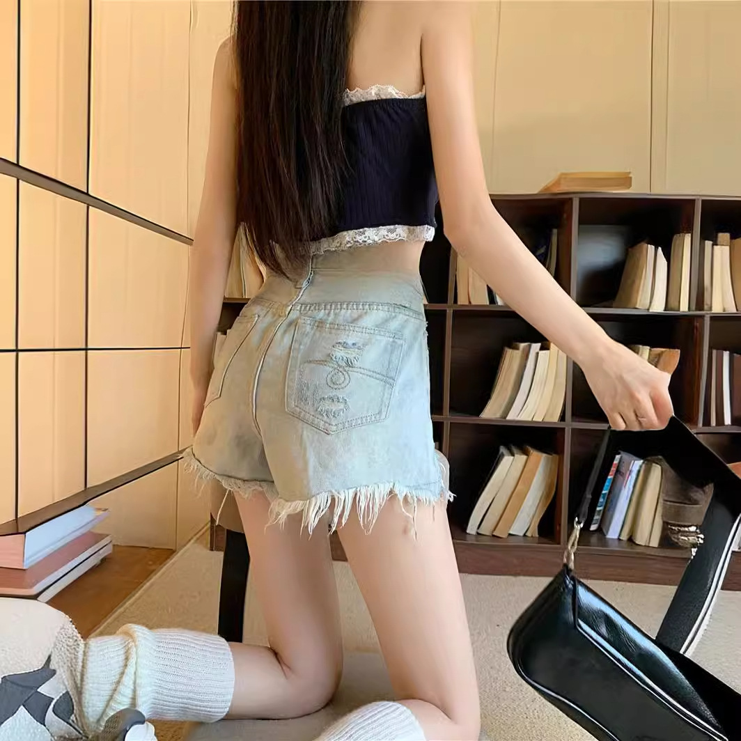 浅色毛边破洞牛仔短裤女夏天辣妹a字热裤小个子高腰显瘦阔腿裤子