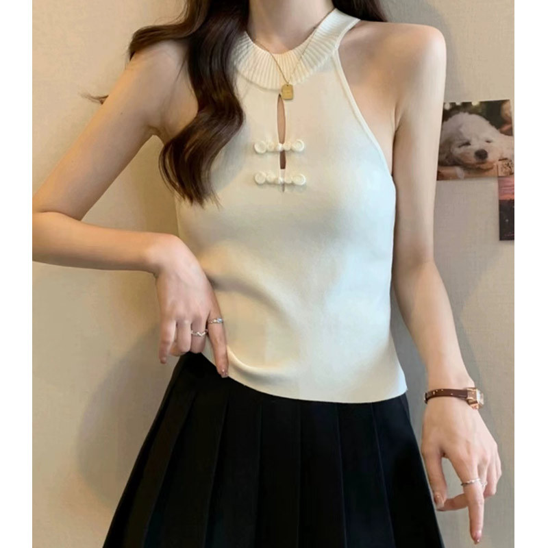 新中式针织衫国风盘扣挂脖吊带背心女夏外穿修身显瘦无袖上衣