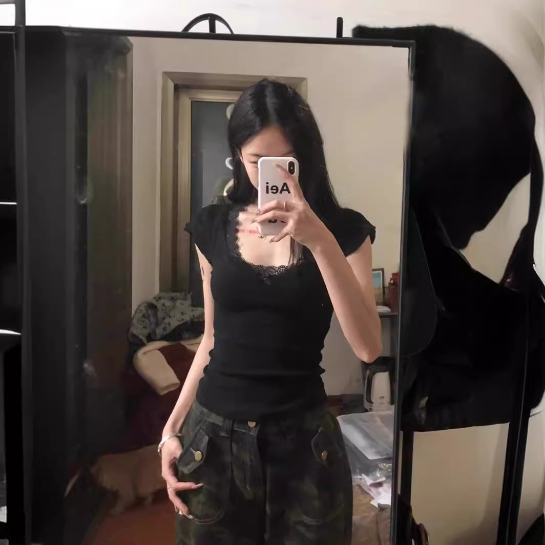 纯欲蕾丝花边锁骨方领短袖t恤女夏季蝴蝶结芭蕾风甜辣妹紧身上衣