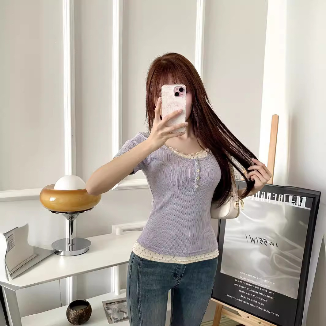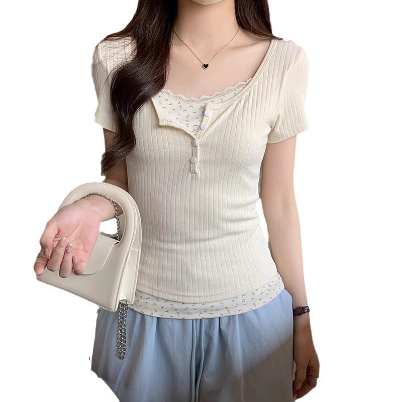 蕾丝花边假两件短袖t恤春夏新款纯欲风辣妹修身显瘦正肩打底上衣