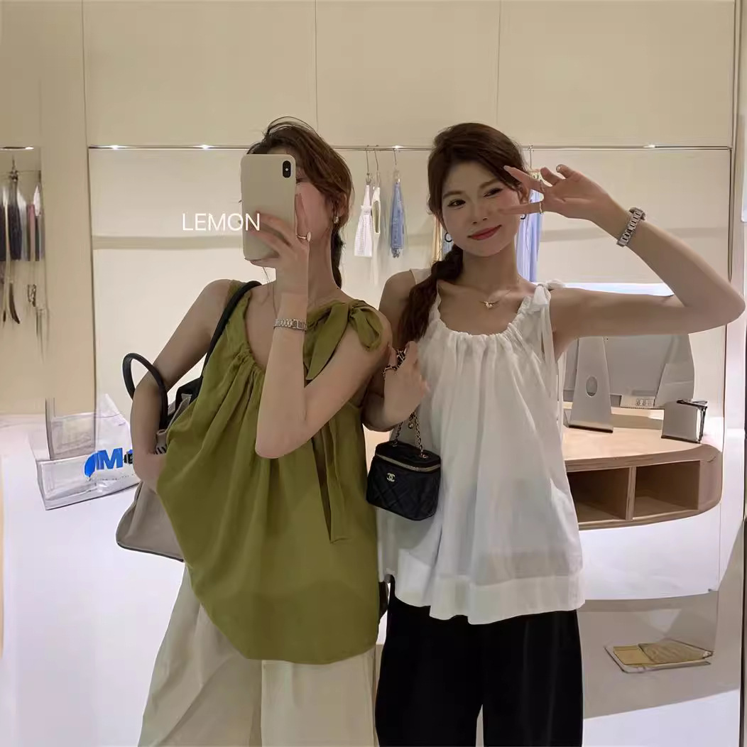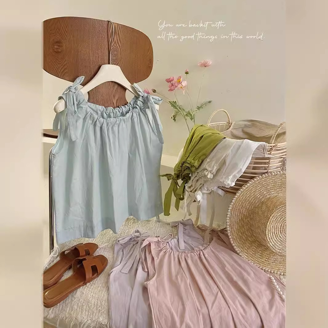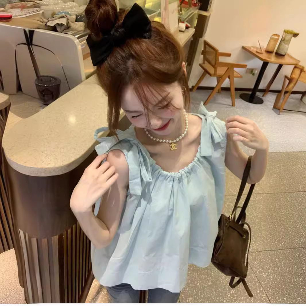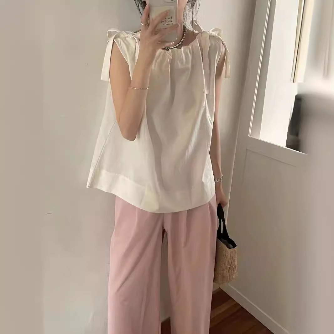 甜美风亚麻宽松无袖衬衫女夏季薄款休闲遮肉娃娃衫抽绳背心衬衫女
